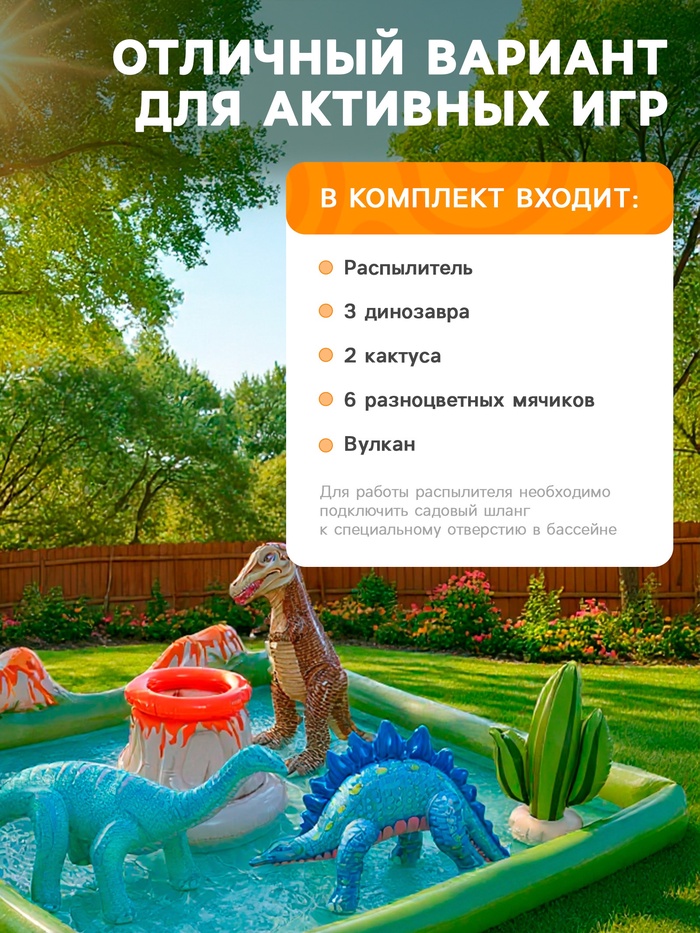 Игровой центр подойдёт для придомового участка. В комплект входит разбрызгиватель, надувные игрушки и мячики.