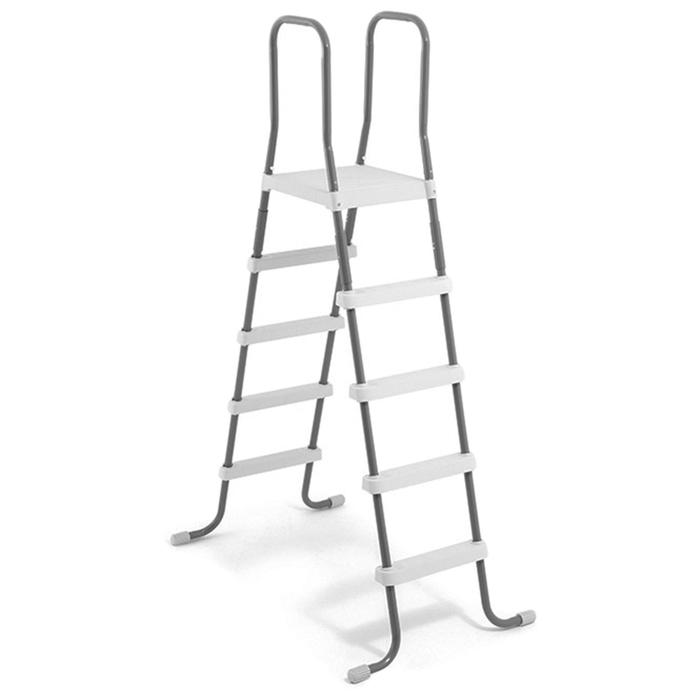 Лестница подходит для каркасных и надувных бассейнов с высотой борта 132 см. Модель оснащена площадкой и четырьмя ступеньками. Металлические стойки лестницы имеют влагозащитное покрытие и колпачки для защиты дна бассейна. Ступеньки и площадка выполнены из усиленного АВS-пластика и имеют противоскользящие насечки.