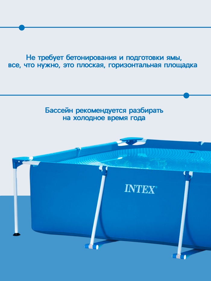 Прямоугольный каркасный бассейн марки INTEX отвлечёт вас от городской суеты и придаст свежесть знойному летнему дню. Насладитесь отдыхом вместе с родными и друзьями. Установка бассейна не отнимет у вас много времени. Благодаря прочному материалу (ПВХ) и металлическому корпусу изделия, вы гарантированно сможете наслаждаться досугом не один сезон. Установите бассейн на заднем дворе дома или на природе и зарядитесь освежающей энергией кристально чистой воды.
