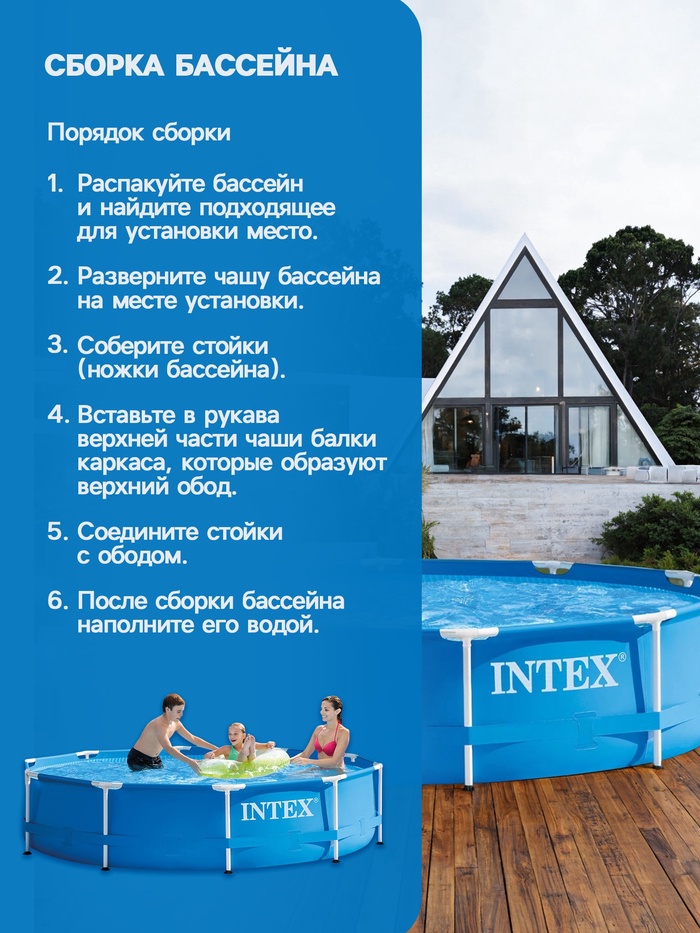 Бассейн вы можете разместить у себя на даче, и в нём с удовольствием (под вашим присмотром) будут плескаться ваши дети. Благодаря своей конструкции, бассейн легко и быстро устанавливается. Процесс сборки бассейна до наполнения водой займет 30 минут.