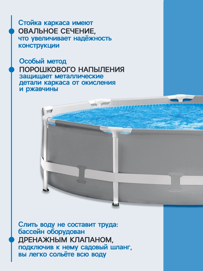Сборный каркасный бассейн с простой, стабильной и надёжной конструкцией. Металический каркас с усиленными стальными трубами с порокшовым покрытием. Даже при больших нагрузках металлический каркас бассейна обеспечит необходимый запас прочности. Технология Super-Touch (сочетание винила и полиэстра), используемая в производстве, наделяет материал тройной прочностью, стойкостью к ударам, воздействию солнечного света, растягиваниям и стираниям. Каркасные бассейны удобны в хранении и в сложенном виде не займут много места. Модель оснащена клапаном для удобства слива воды.