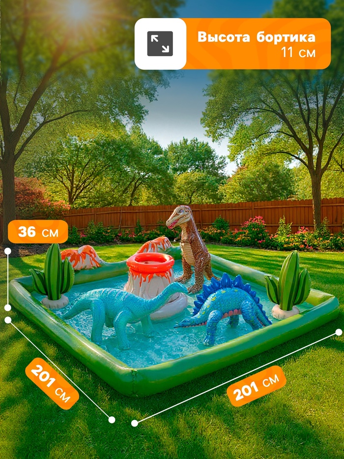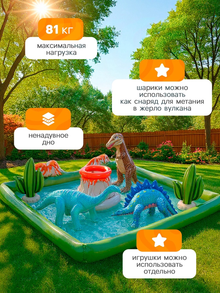 Игровой центр подойдёт для придомового участка. В комплект входит разбрызгиватель, надувные игрушки и мячики.