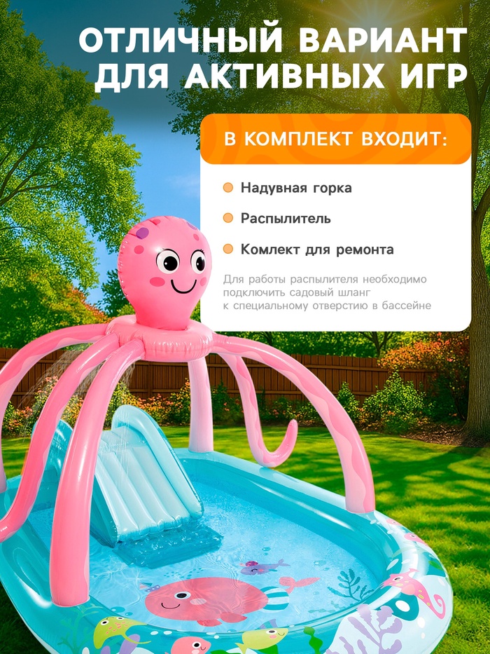 Детский надувной центр создан для игр на придомовом участке. Модель оснащена горкой и распылителем, который подключается к садовому шлангу. На конце горки расположен надувной коврик, он убережёт ребенка от ушибов. Также в конструкции есть сливной клапан.