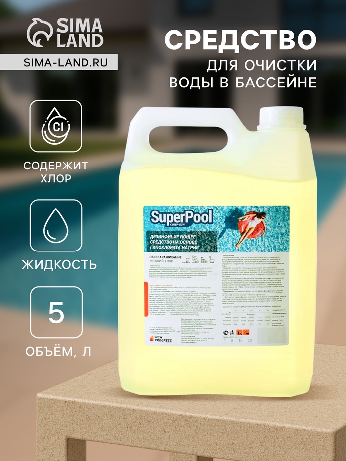 Дезинфицирующее средство «Супер-пул Жидкий хлор» на основе гипохлорита натрия применяется для обеззараживания воды в системе хозяйственно-питьевого водоснабжения, плавательных бассейнах и аквапарках в соответствии с требованиями санитарно-эпидемиологической безопасности и поддержания воды в бассейнах в пределах санитарных норм; для мытья и дезинфекции санитарно-технического оборудования, кафеля, пластика, унитазов, мусорных вёдер.
