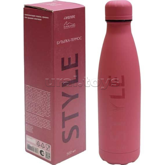 Бутылка-термос "Marandi" 500 мл, 26,3x7,6x7,6 см, 8-12 часов, нержавеющая сталь, с герметичной крышкой-пробкой, матовая, бордовая, лакированная надпись STYLE