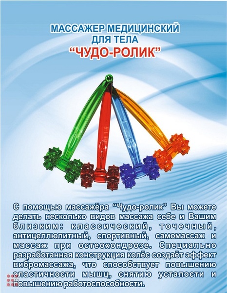 Массажер «Чудо-Ролик» был разработан ведущими специалистами в области оздоровительного массажа. С помощью массажера медицинского для тела «Чудо-Ролик» Вы можете делать несколько видов массажа себе и Вашим близким: классический, точечный, антицеллюлитный массаж и самомассаж.