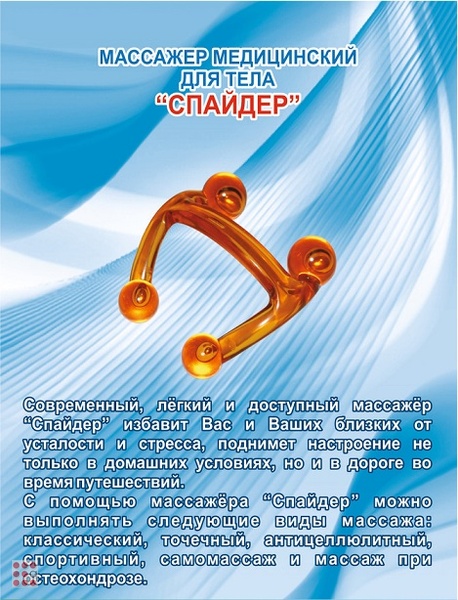 Остеохондроз. Отличительной особенностью массажера «Спайдер» является удобное расположение массажных шаров для воздействия на все группы мышц вдоль позвоночного столба, благодаря этому достигается действительная разгрузка позвоночника, снятие мышечного напряжения. Это приводит к уменьшению болезненности при радикулите и остеохондрозе, увеличению подвижности позвоночника, нормализации кровообращения во внутренних органах, а также коррекции осанки.