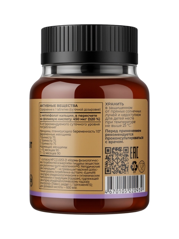 * Высокая биодоступность. L‑Метилфолат — активная форма фолиевой кислоты, которая сразу включается в биохимические процессы организма.