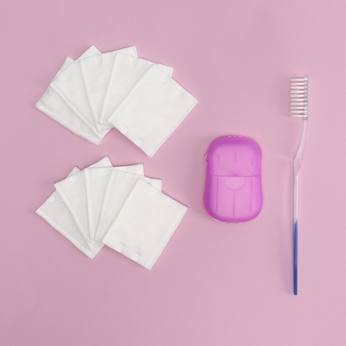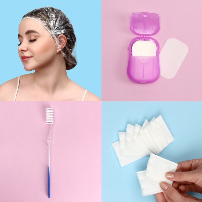 Дорожный набор, 4 предмета, шапочка, щётка, мыло 18 (± 2) листов, ватные диски 10 штук