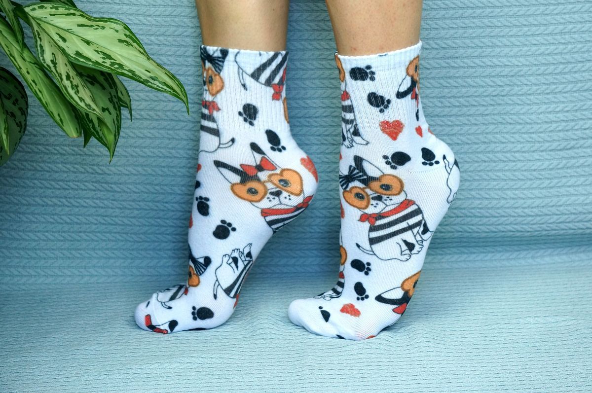 Производим новый продукт на Российском рынке: хлопковые носки с принтом Коттон Принт. Носки вяжутся из гигроскопичной хлопковой пряжи с содержанием натурального хлопка 70%. Благодаря этому носок эластичен, впитывает влагу и чрезвычайно комфортен на ноге. Кеттельный шов, это там где пальцы, выполняется на новом европейском оборудовании и никак не ощущается. Цветной принт наносится экологически чистыми чернилами на водной основе на всю тощину трикотажа, не выцветает и не линяет. Картинка получается яркой и стойкой, к тому же с изнанки нет бахромы которая присутствует на носках с жаккардовым рисунком и которая создает затруднения при надевании. 70% хлопка в составе позволит ногам чувствовать комфорт с утра и до вечера. Комфортная резинка из мягкого эластана не давит и не съезжает. Нашу продукцию стираем вместе с другой одеждой как однотонный хлопковые вещи, при температуре до 90 градусов. Хотите такой же принт на шерсти? Звоните! Этот же принт на шерстяном носке
