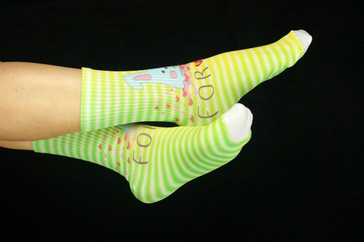Производим новый продукт на Российском рынке: хлопковые носки с принтом Коттон Принт. Носки вяжутся из гигроскопичной хлопковой пряжи с содержанием натурального хлопка 70%. Благодаря этому носок эластичен, впитывает влагу и чрезвычайно комфортен на ноге. Кеттельный шов, это там где пальцы, выполняется на новом европейском оборудовании и никак не ощущается. Цветной принт наносится экологически чистыми чернилами на водной основе на всю тощину трикотажа, не выцветает и не линяет. Картинка получается яркой и стойкой, к тому же с изнанки нет бахромы которая присутствует на носках с жаккардовым рисунком и которая создает затруднения при надевании. 70% хлопка в составе позволит ногам чувствовать комфорт с утра и до вечера. Комфортная резинка из мягкого эластана не давит и не съезжает. Нашу продукцию стираем вместе с другой одеждой как однотонный хлопковые вещи, при температуре до 90 градусов. Хотите такой же принт на шерсти? Звоните! Этот же принт на шерстяном носке
