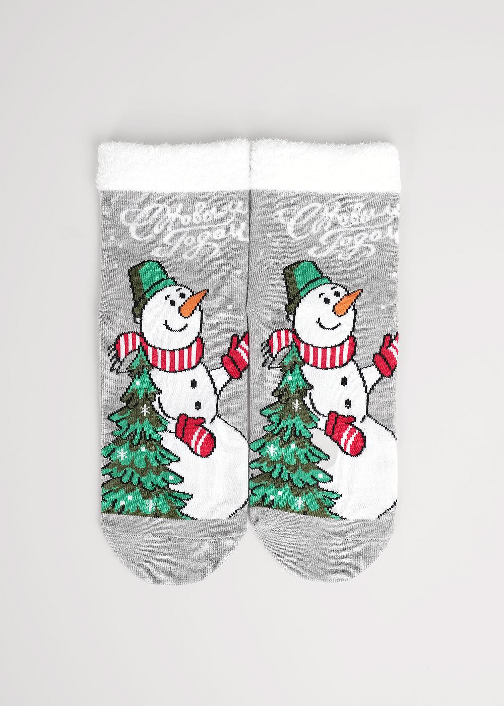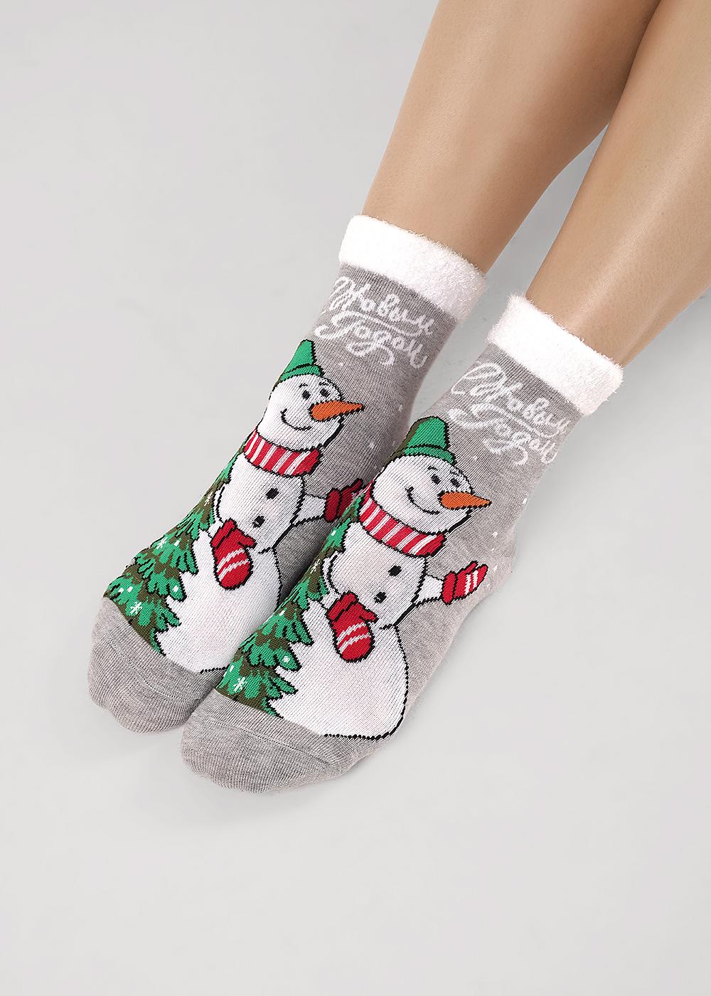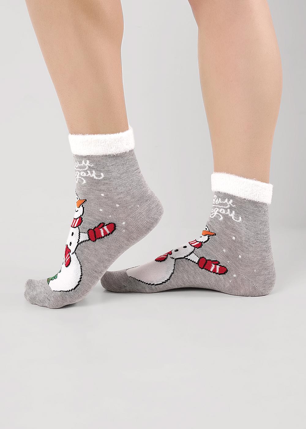 женские носки с рисунком снеговика, надписью с новым годом, борт выполнен из пряжи травка