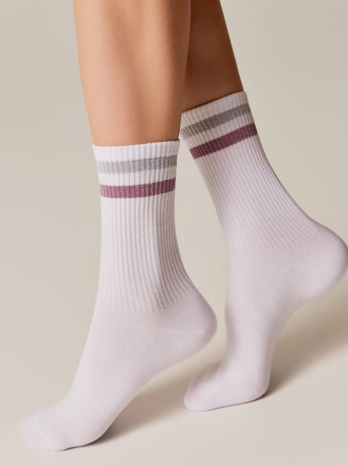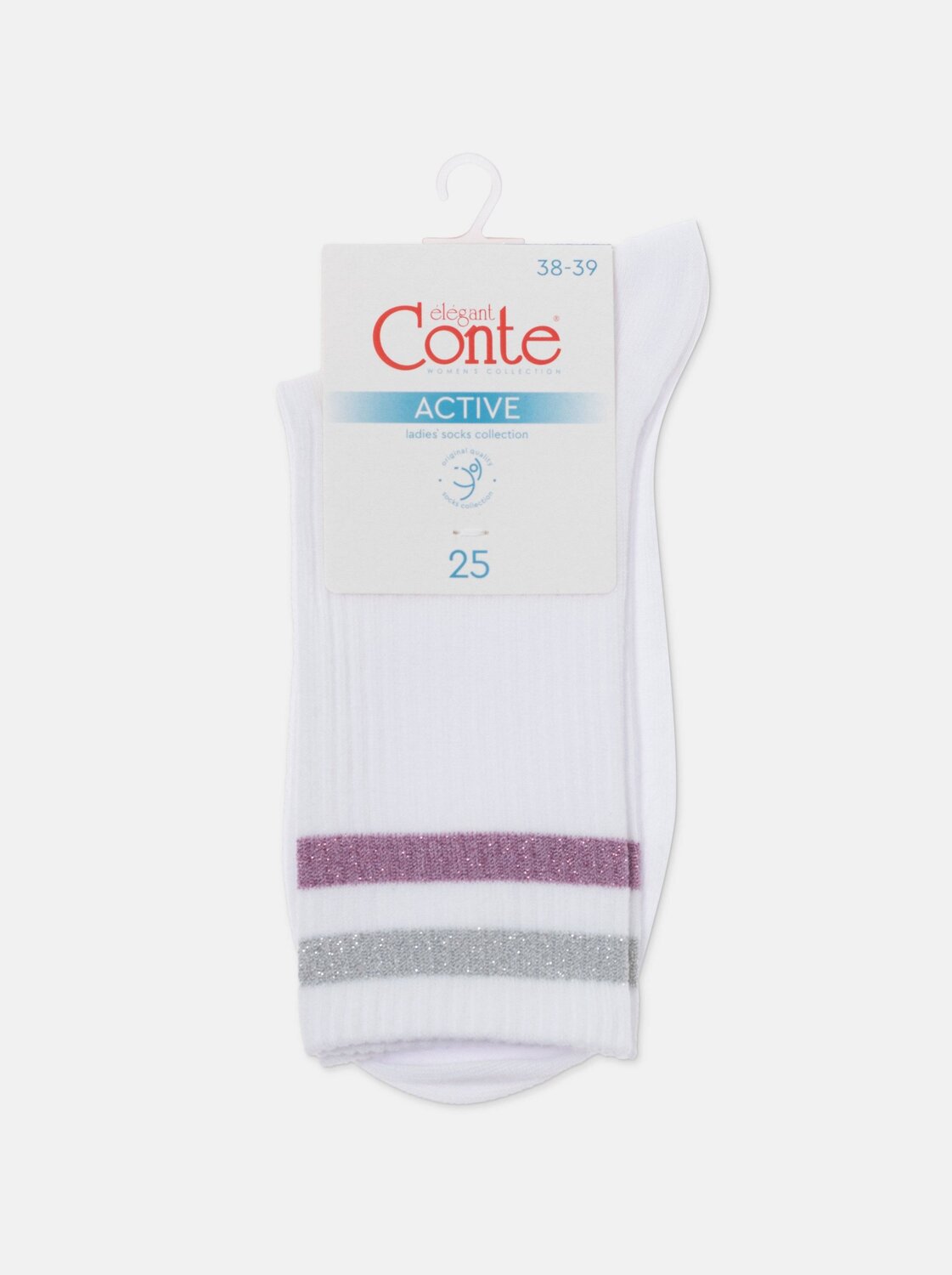 Хлопковые носки с яркими полосками из люрекса смотрятся так стильно и оригинально, что вам не захочется прятать их под одеждой. Смело носите трендовые носочки ACTIVE в стиле спорт-шик и с удовольствием подчеркивайте свою индивидуальность.
