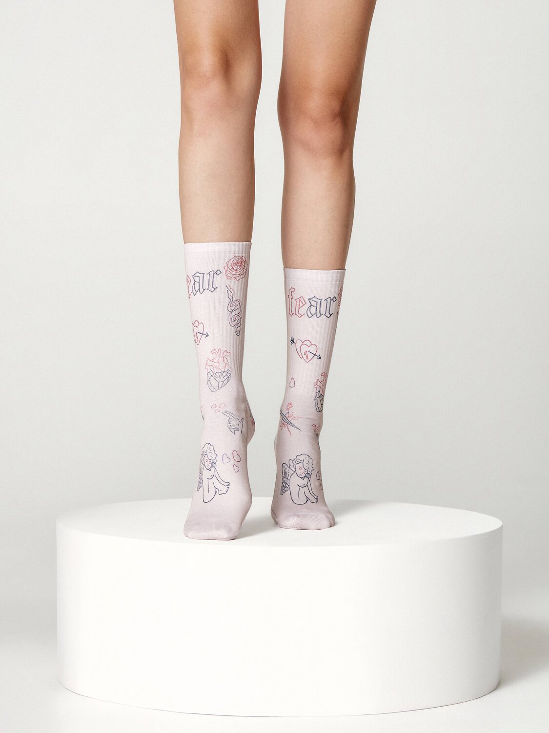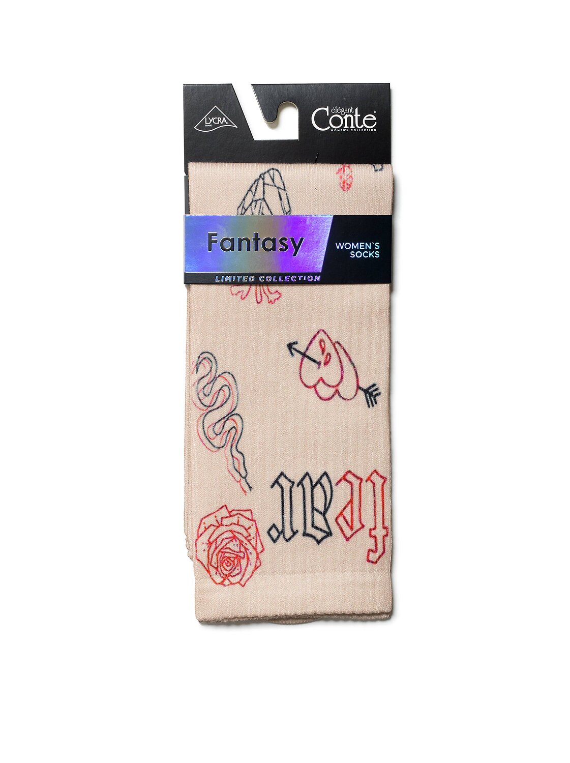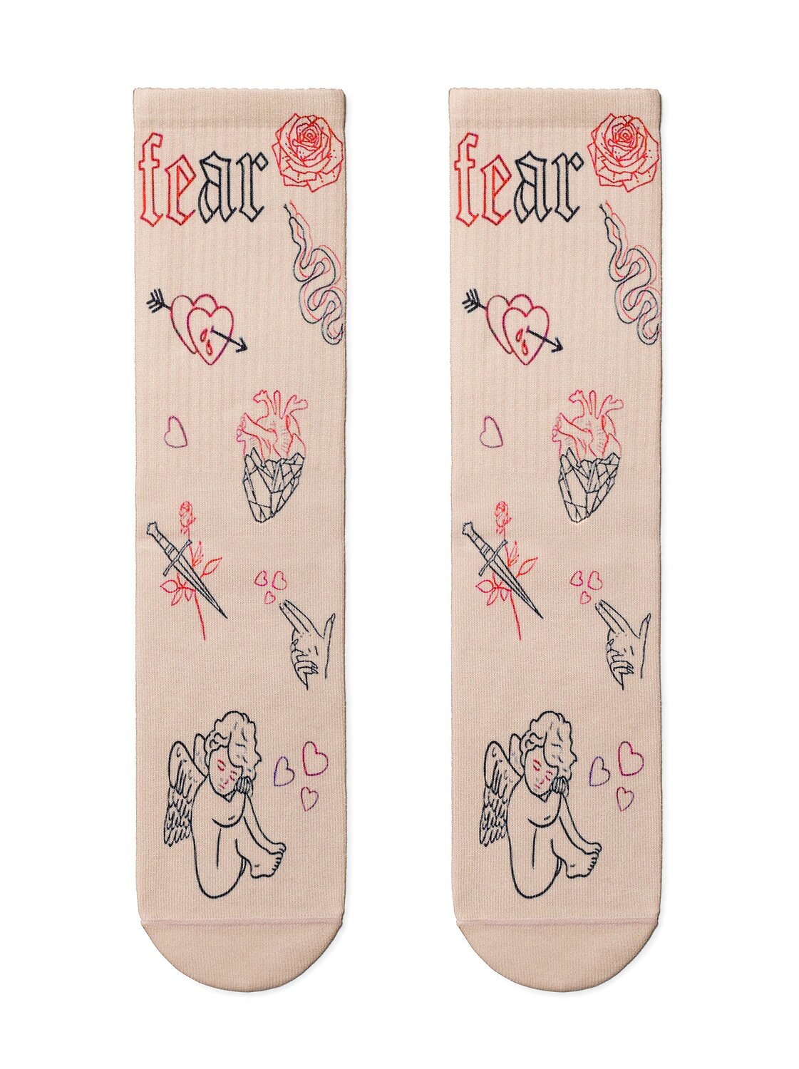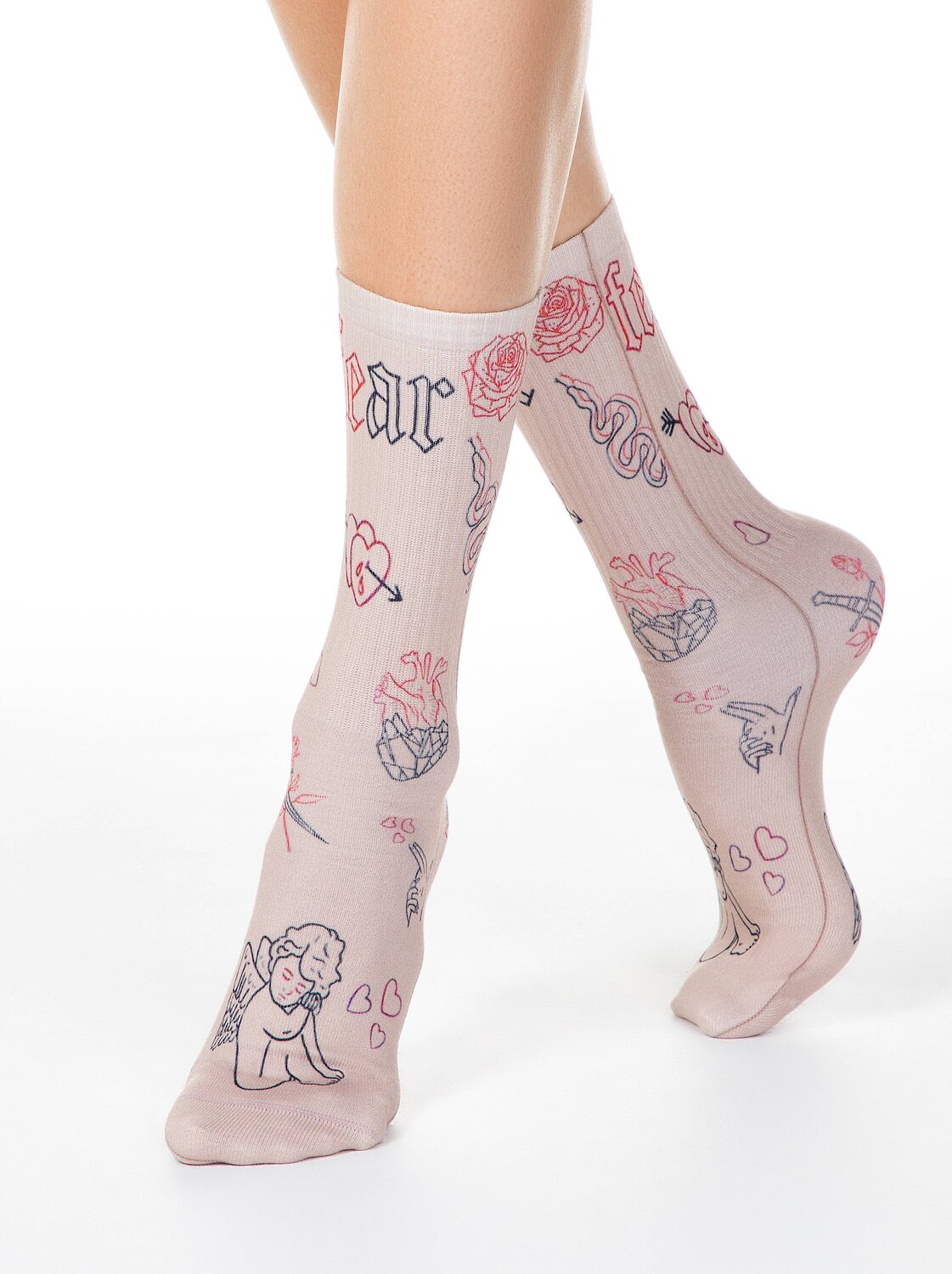 Удлиненные хлопковые носки FANTASY с печатными рисунками тату-эскизов добавят яркую изюминку в образ. Носки плотно облегают ногу и не сползают благодаря эластичному рельефному паголенку-резинке.