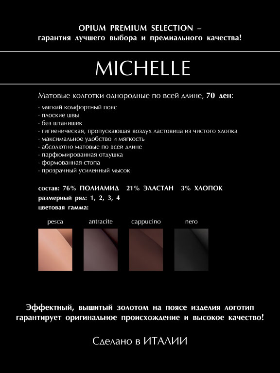 Мягкий комфортный пояс, плоские швы, без штанишек, гигиеническая, пропускающая воздух ластовица из чистого хлопка, максимальное удобство и мягкость, абсолютно матовые по всей длине, парфюмированная отдушка, формованная стопа, прозрачный усиленный мысок, эффектный, вышитый золотом на поясе изделия логотип гарантирует оригинальное происхождение и высокое качество.