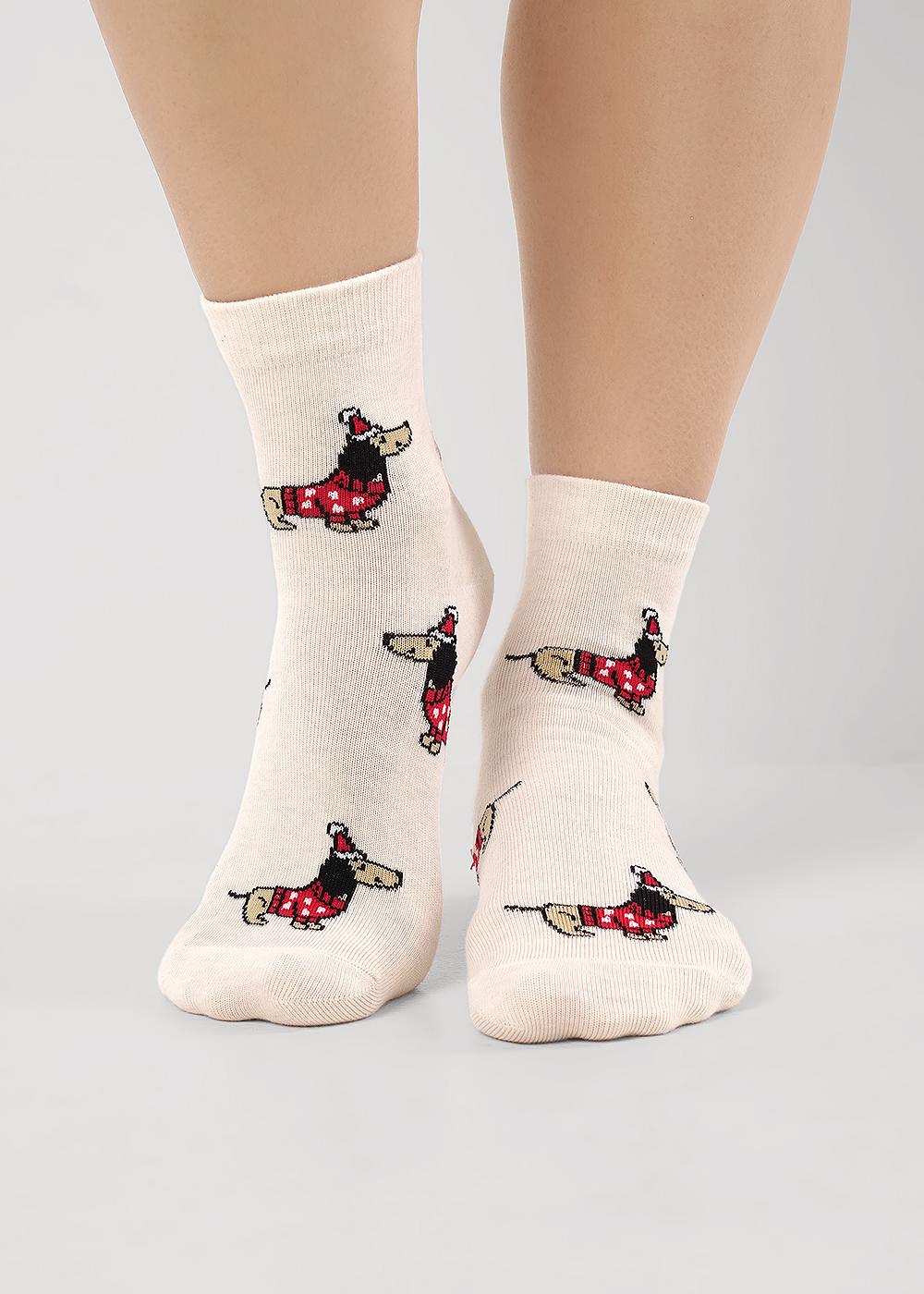 "Описание: Носки женские с рисунком собак такс в новогодних костюмах