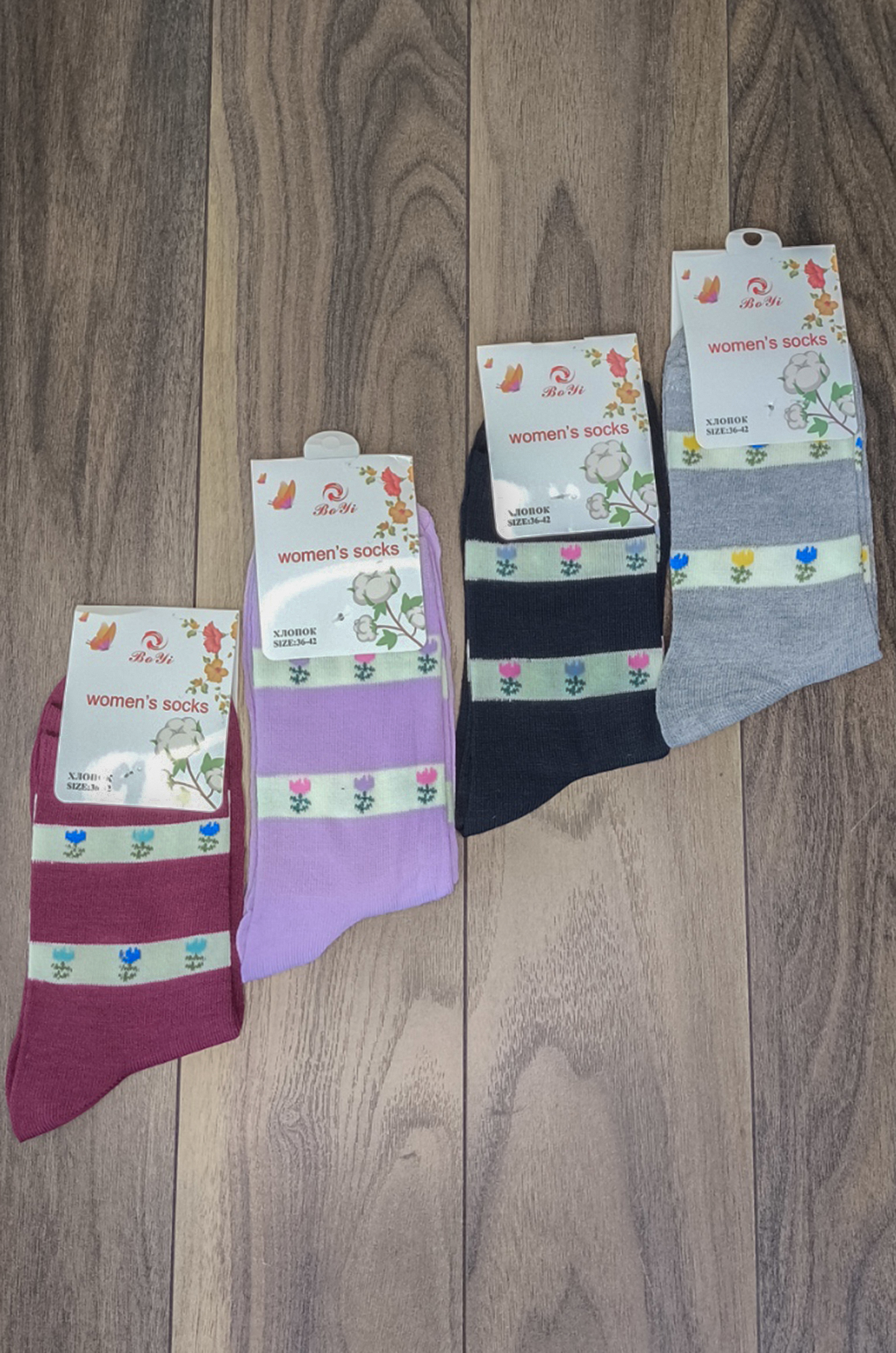 Тонкие хлопковые женские носочки классической высоты, на паголенке рисунок, эластичная резиночка. Модель из хлопка с добавлением пэ нити. Производство Китай.