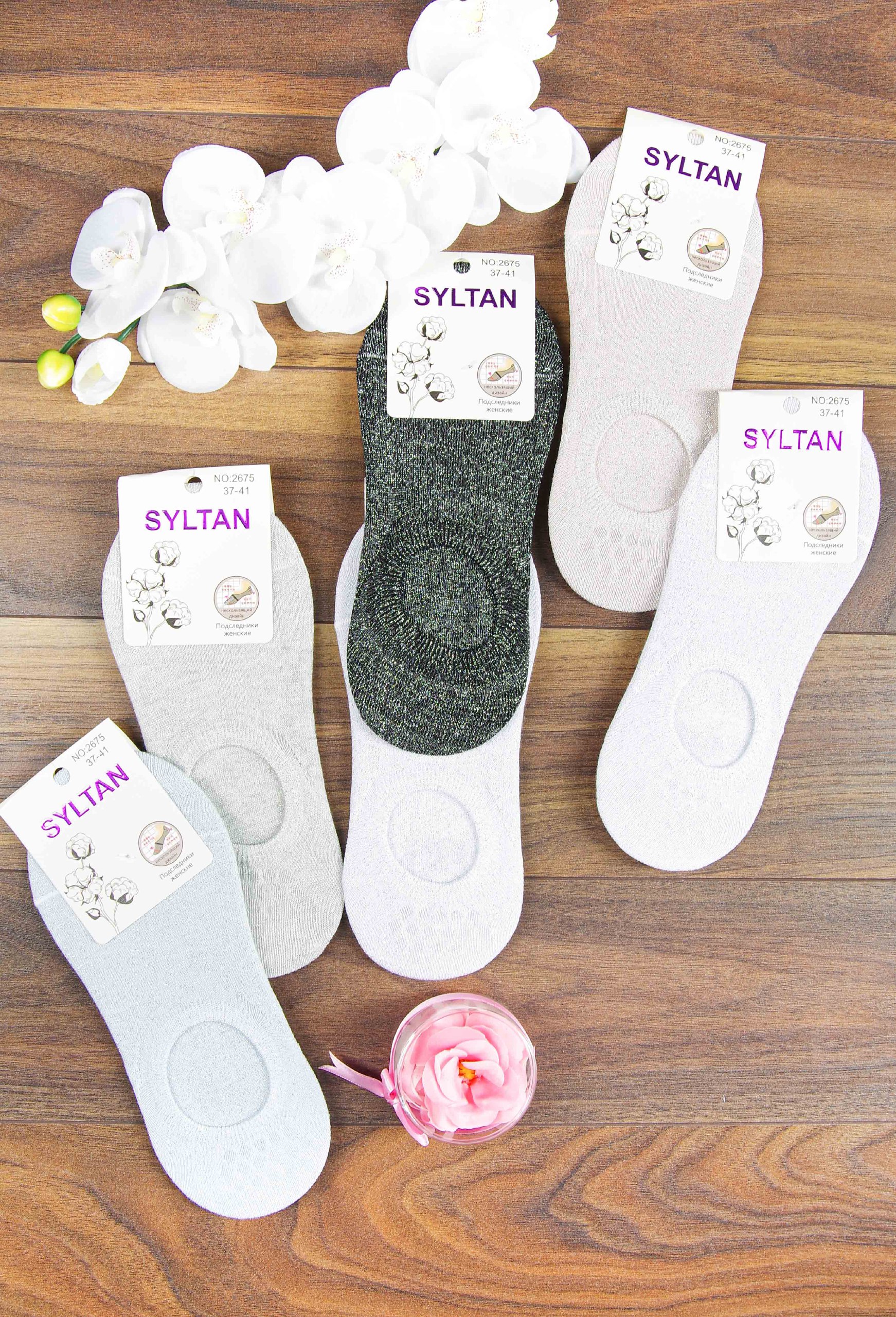 Необычные и очень красивые женские следочки с люрексом - это Хит сезона! Модель глубокая, хорошо облегает ножку, пятка внутри с нескользящим силиконовым дизайном.