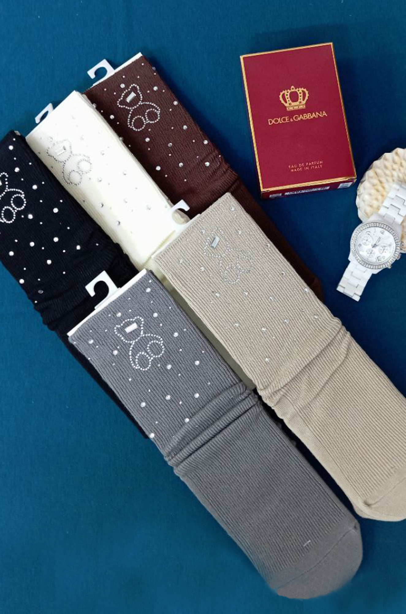 Женские однотонные носочки с высоким паголенком и россыпью страз. Модель из плотного, мягкого и эластичного хлопка с добавление лайкры.