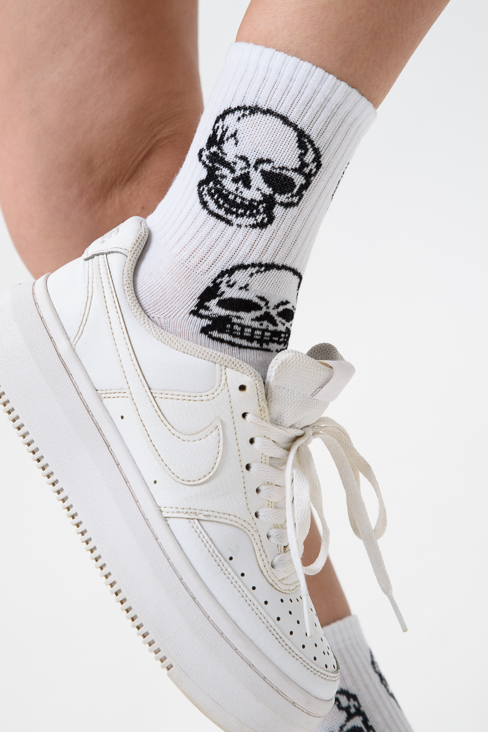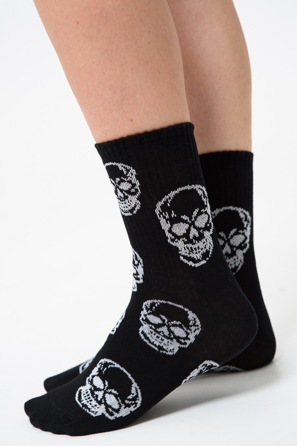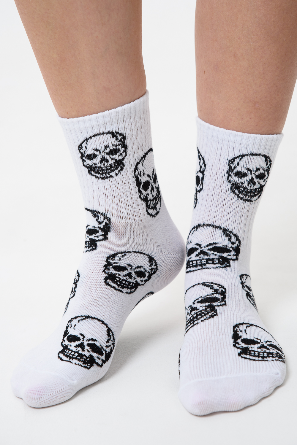 Женские носки с изображением черепов. Широкая резинка по всей верхней части носка. Расцветка: белый, черный (ед.); Состав: 80% х/б 18% ПА 2% эластан.