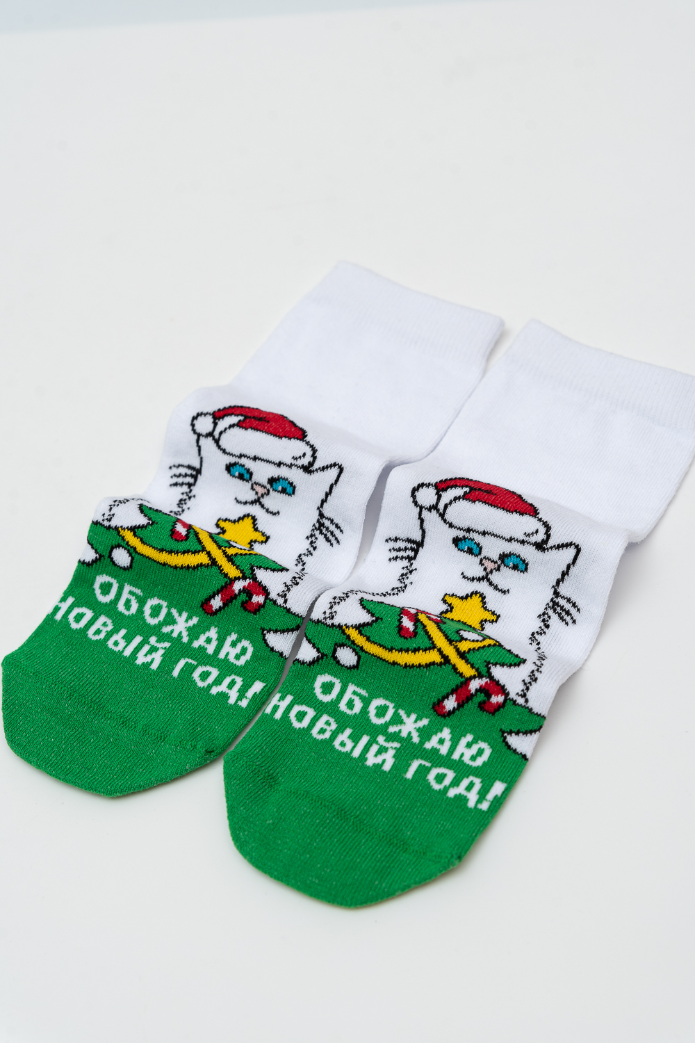 -Новогодние женские носки с изображением новогодней елки и кота. Отличный подарок на праздник! Расцветка: белый (ед.); Состав: 75% х/б 21% ПА 2% ПП 2% эластан.