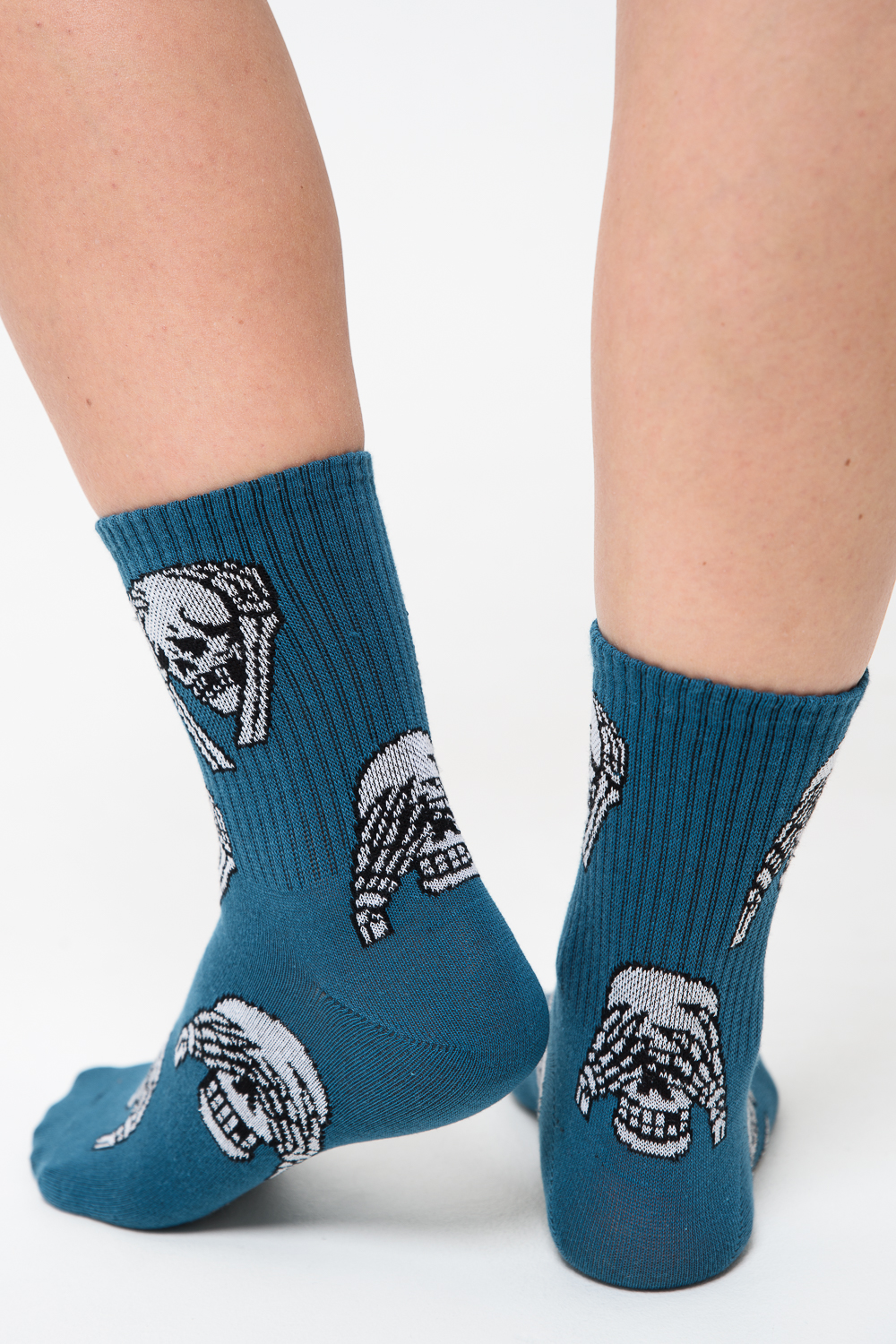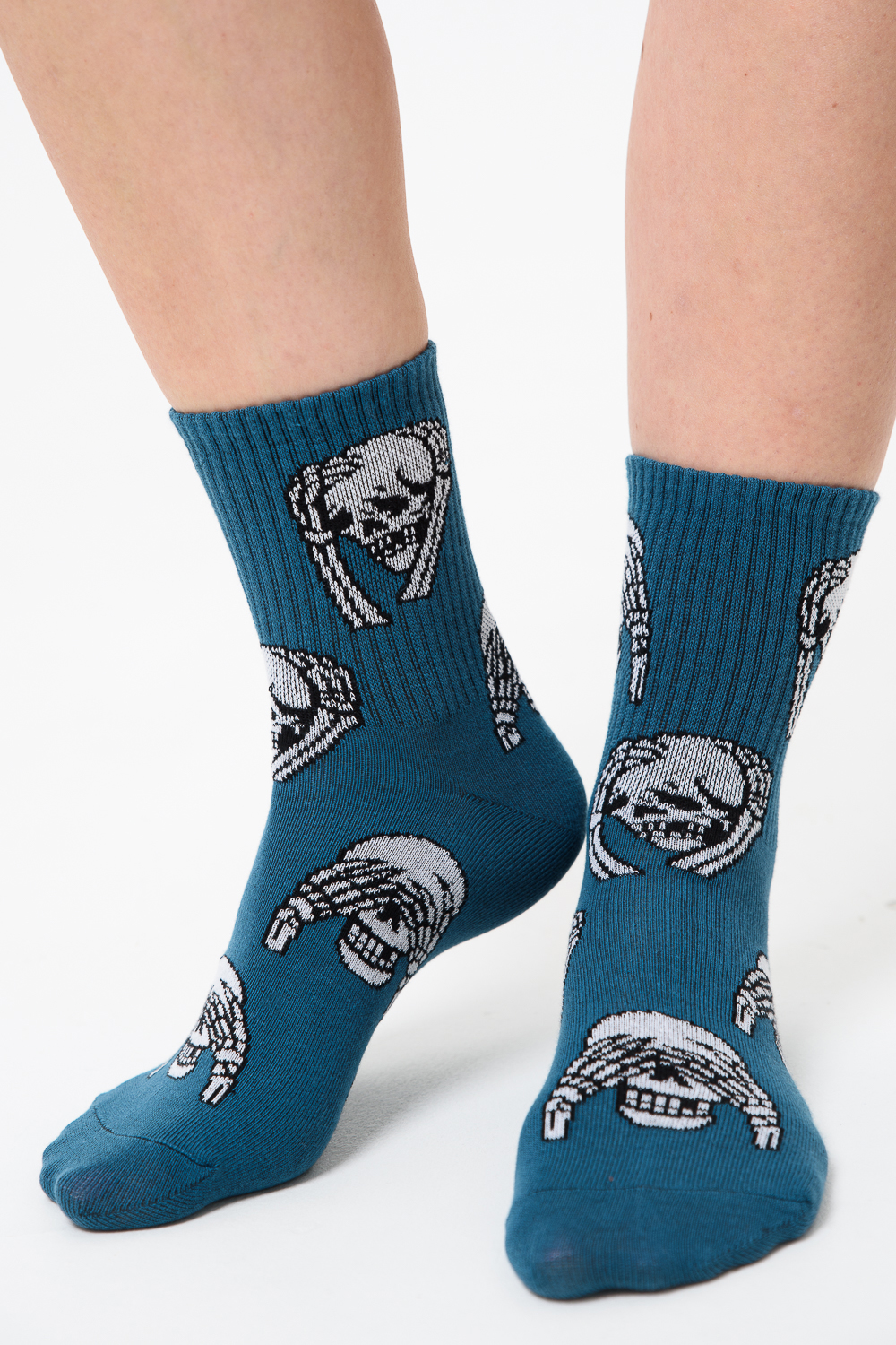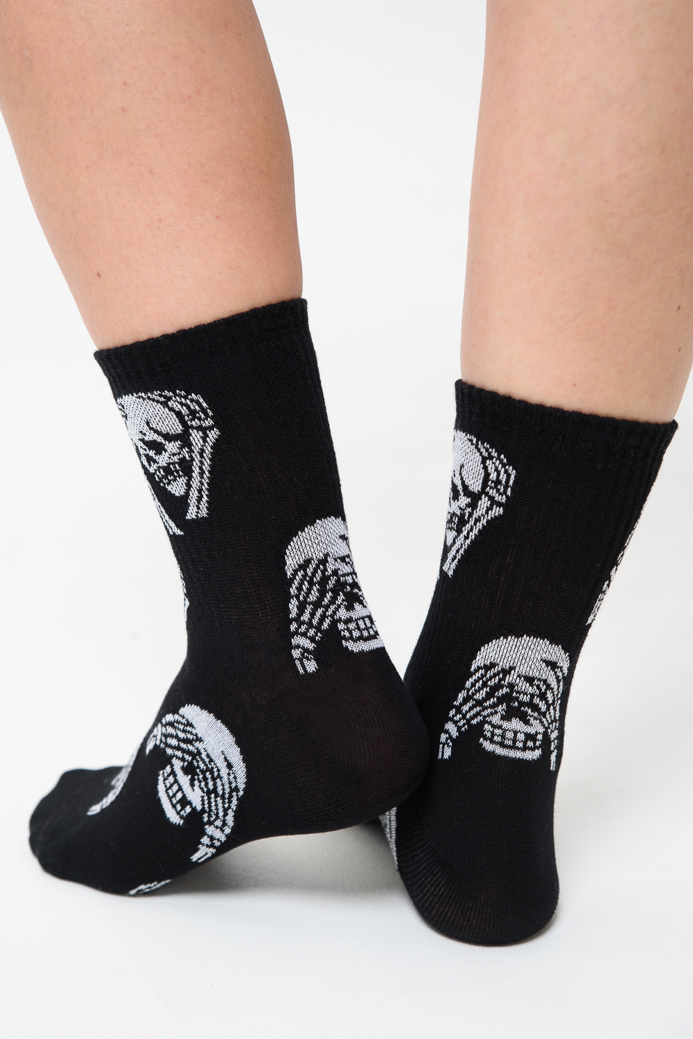 Женские носки с изображением черепов. Широкая резинка по всей верхней части носка. В комплекте 4 пары. Расцветка: белый, джинс, черный, оранжевый (ед.); Состав: 80% х/б 18% ПА 2% эластан.