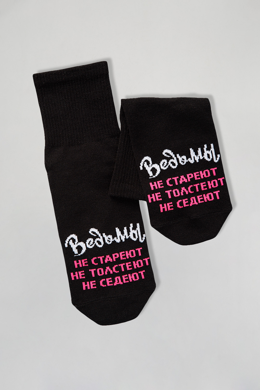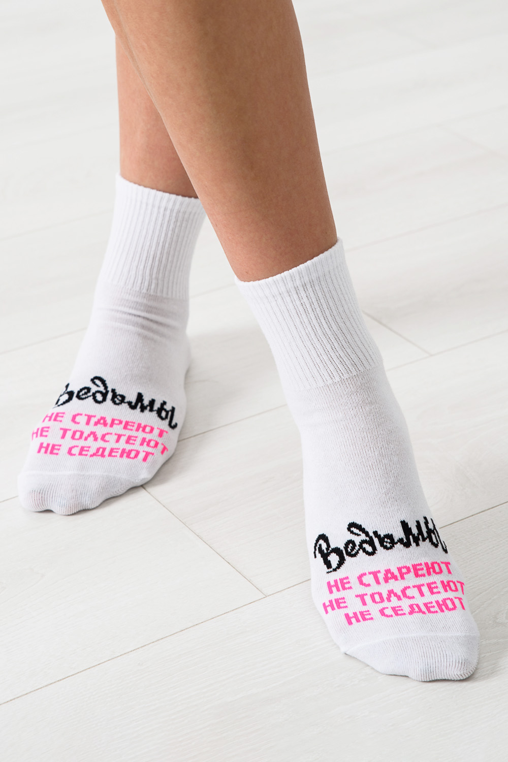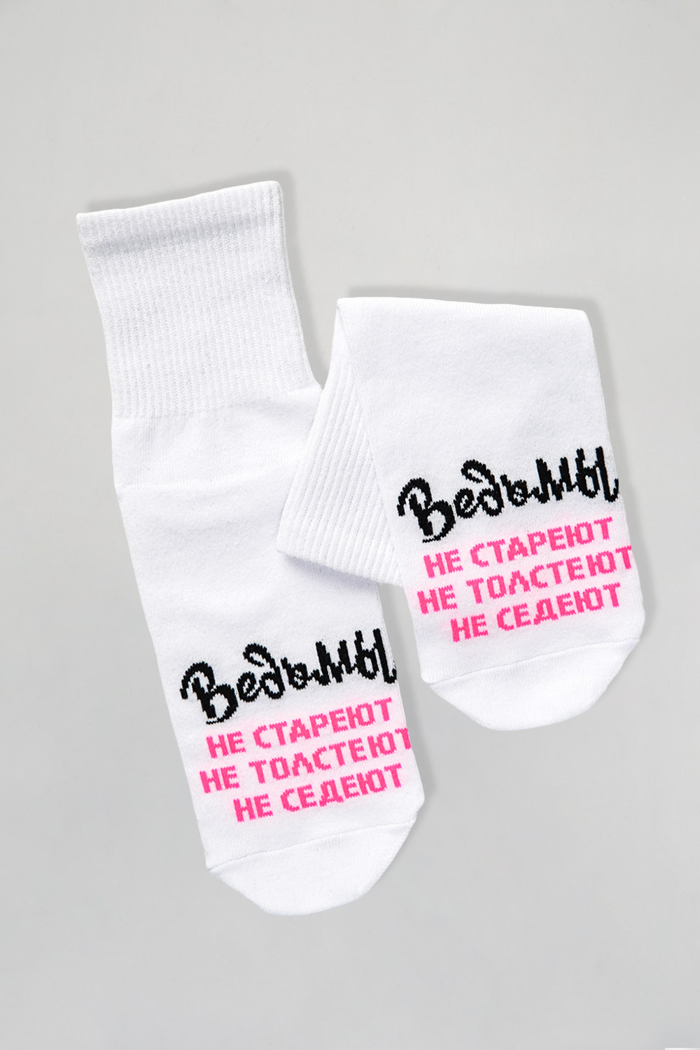 Добавьте в свой образ чуточку магии и юмора с этими стильными носками! Белые носки с яркой надписью «Ведьмы не стареют, не толстеют, не седеют» созданы для тех, кто любит быть в центре внимания и всегда верит в маленькие чудеса. Мягкий и приятный к телу материал подарит комфорт на весь день, а оригинальный дизайн подчеркнёт вашу индивидуальность. Отличный подарок для себя или подруги, которая уверена: всё волшебство — в ней самой! Цвет: белый; Состав: 71% х/б 23% ПА 4% ПП 2% эластан.
