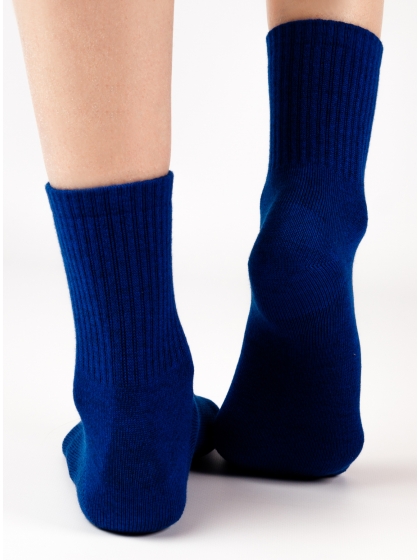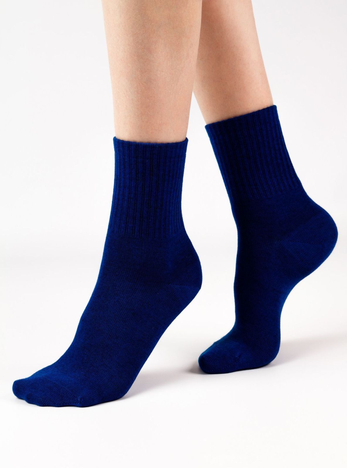 Женские носки торговой марки Indefini. Женские высокие теплые носки синего цвета изготовлены из смеси материалов для комфорта и тепла. Они содержат вискозу и полиэстер для мягкости и воздухопроницаемости, акрил для прочности и эластан для эластичности. Кроме того, они содержат овечью шерсть для дополнительного тепла. Эти носки идеально подходят для холодных дней и гарантируют удобство в течение всего дня.