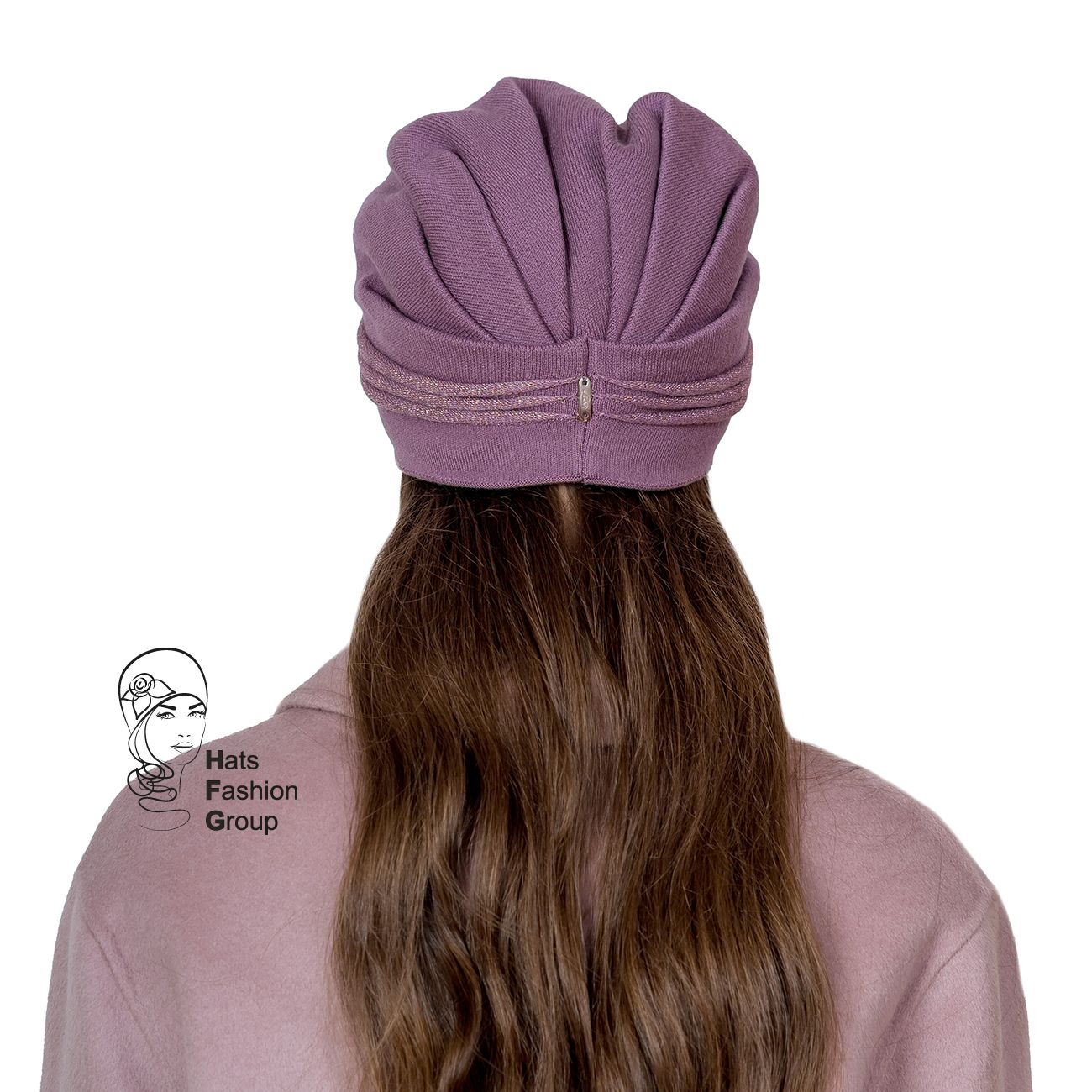Шикарная женская шапка-бандана. Женская шапка выполнена из гипоаллергенной вискозной пряжи, дополнительно утеплена флисовой подкладкой. Фиксированная драпировка складок сзади придают дополнительный объем. Уникальная по форме шапка. По окружности шапка украшена руликами из люрексовой нити, спереди - пришивными камнями и фирменной шильдой. Теплая женская шапка прекрасно держит форму, приятная на ощупь. Комфортная и теплая шапка, отлично подойдет для холодов. Шапка АКСИНЬЯ  придаст вам женственности и романтичности.