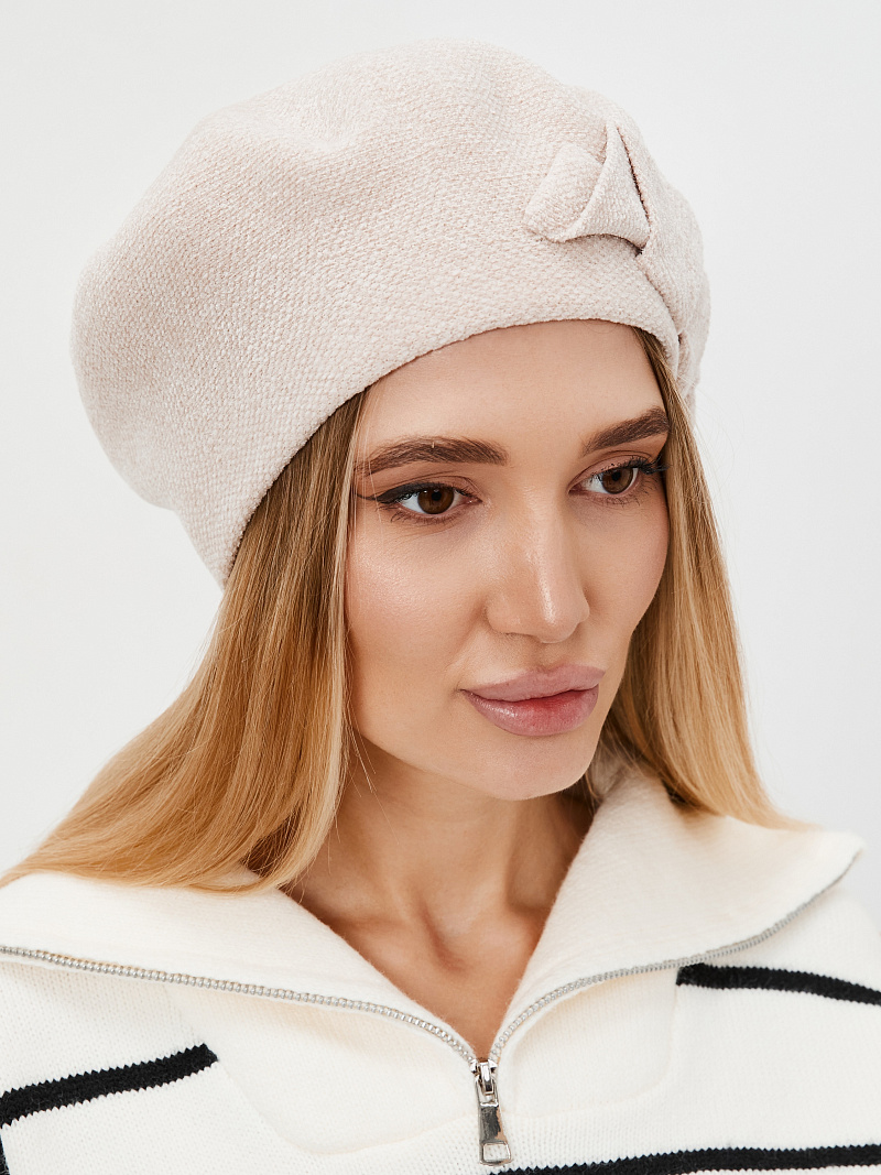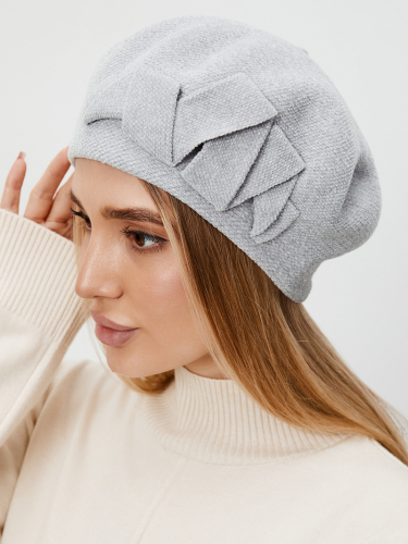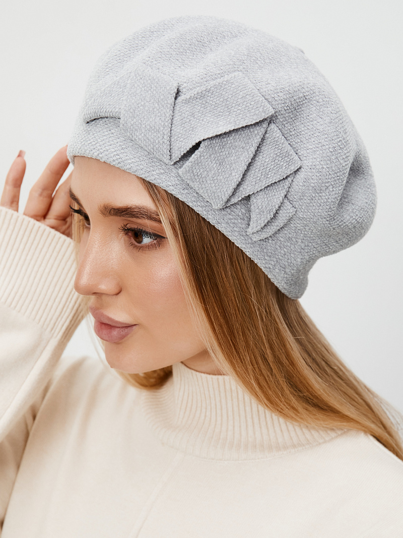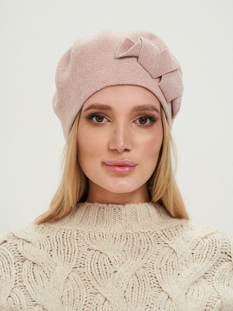 Берет двойной с велюром, текстурная вязка, оригинальный стильный бант.