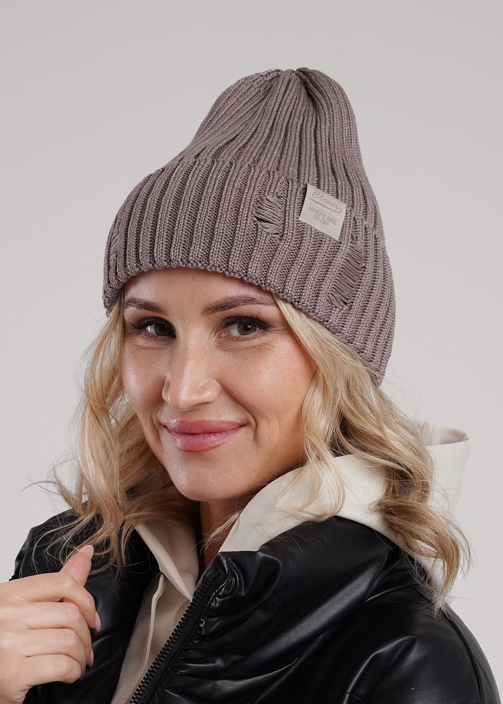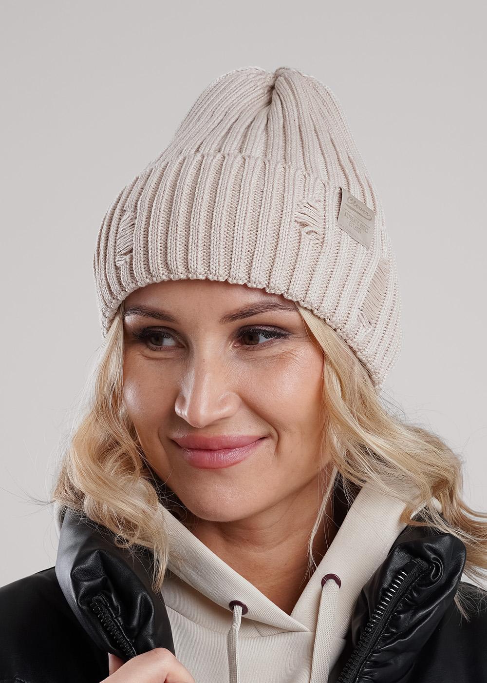 "Описание: Хит сезона- рваная шапка в стиле кежуал. Шапка женская с отворотом и макушкой- тыковка, декорирована стильной нашивкой в височной зоне. Отлично подойдет для холодной осени- тёплой зимы.