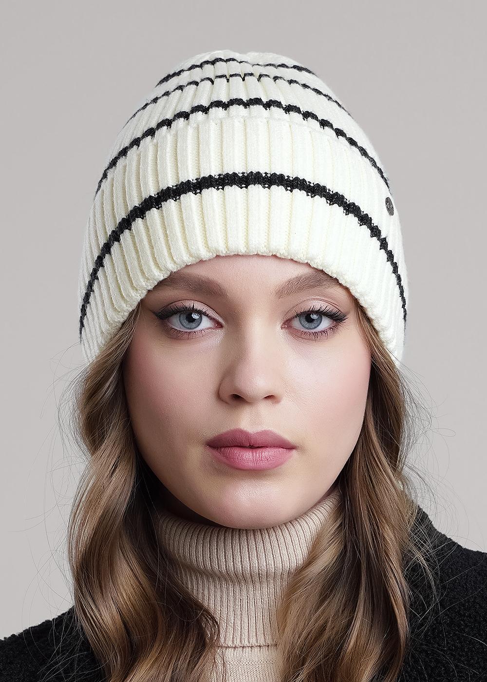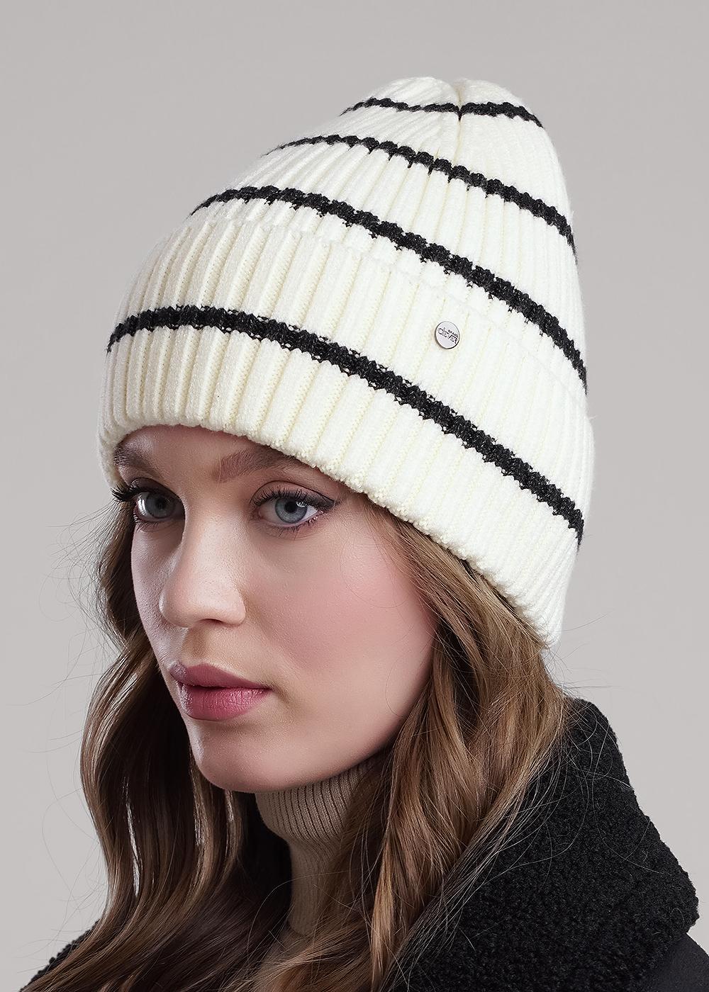 "Описание: Шапка женская однослойная с отворотом, без подклада. Выполнена из высококачественной пряжи, декорирована стильной нашивкой. Станет не только отличной защитой от холода, но и модным аксессуаром.