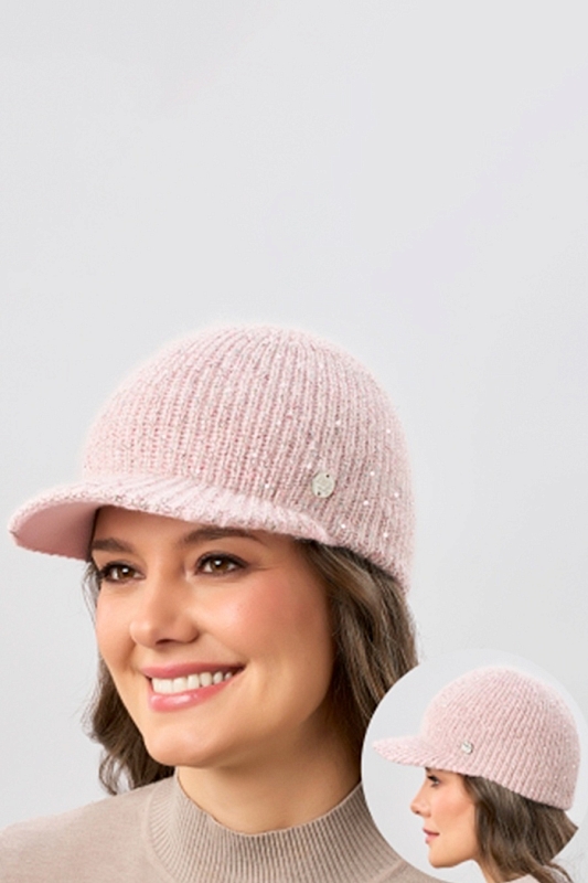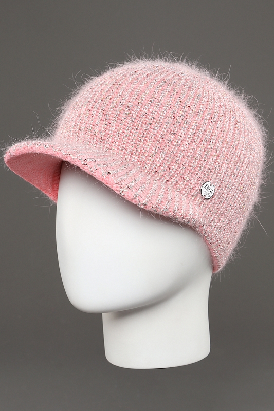 Бейсболка-шапка двойная с небольшим твердым козырьком. Выполнена из пряжи "Angora" с добавлением нити люрекса и пайеток.