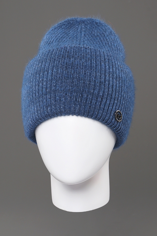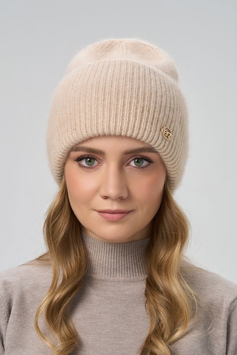 Шапка одинарная с широким двойным отворотом из пряжи, содержащей мех енота.