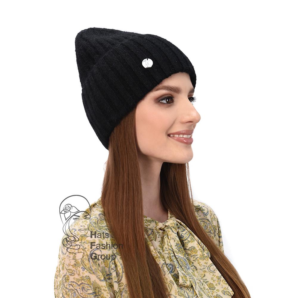 Женская одинарная шапка с широким отворотом. Шапка выполнена из пряжи с большим содержанием ангоры, с добавлением люрекса.  Сбоку отворот украшен фирменной металлической шильдой.