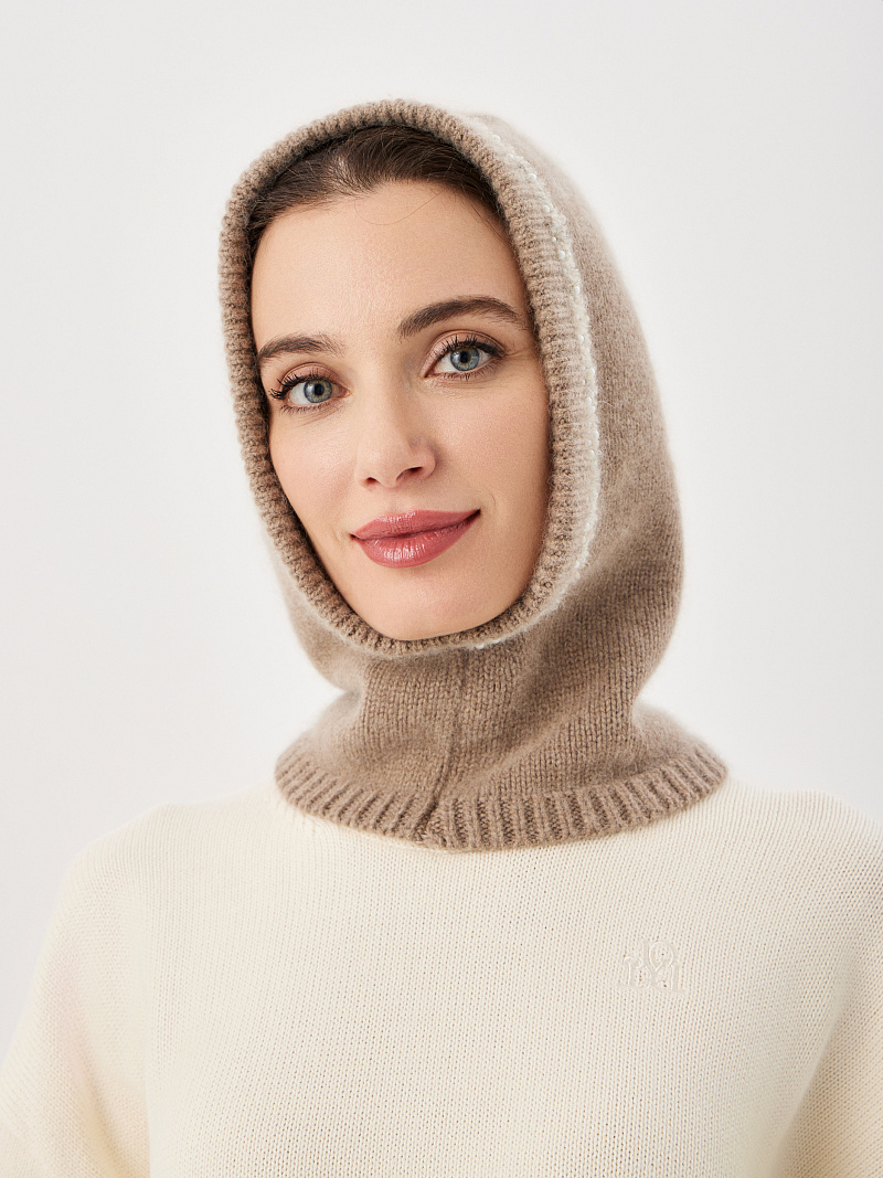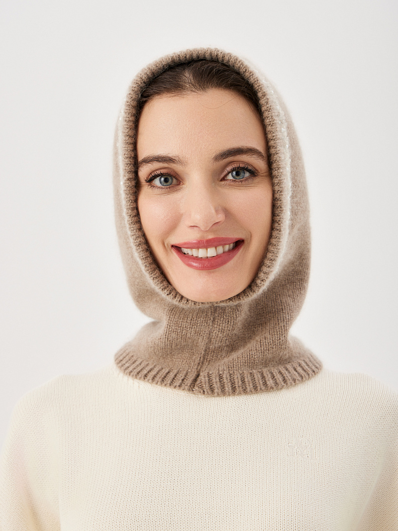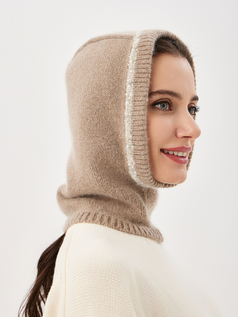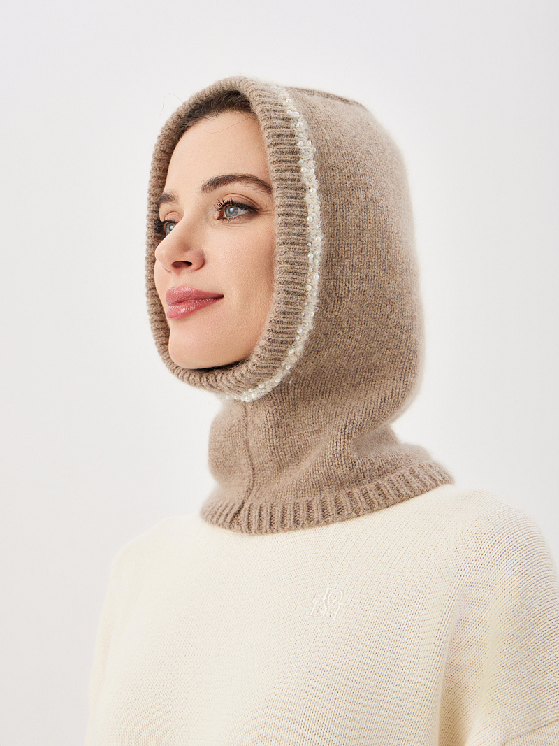 Капюшон одинарный, пух енота, шерсть мериноса, жемчуг.