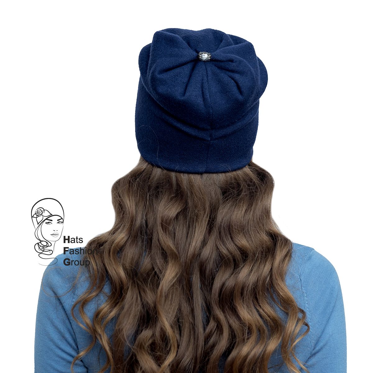 Стильная женская двойная шапка-бандана из трикотажного полотна. Сзади шапке придают объем декоративные складки. На макушке - ювелирный камень.