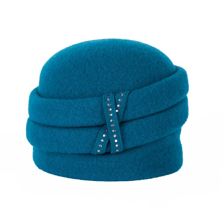 Элегантная женская шапка украшена двумя ассиметричными крупными складками по окружности, придающими форму и объем. Сбоку складки украшает тесьма из основного полотна со стразами в тон полотна.