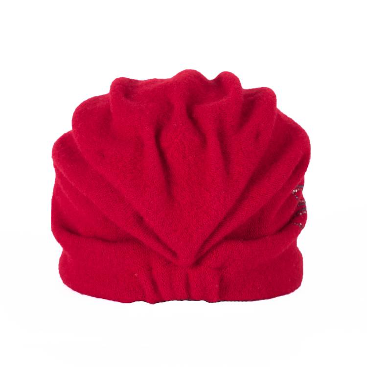 Элегантная шапка-бандана с мягкой драпировкой складок и фигурными защипами сзади. Сбоку украшена вышивной композицией, выполненной контрастной нитью. Дополняют орнамент  стразы разного диаметра и прозрачные бусины. Сзади вшита резинка, позволяющая изделию садится на любой размер головы.