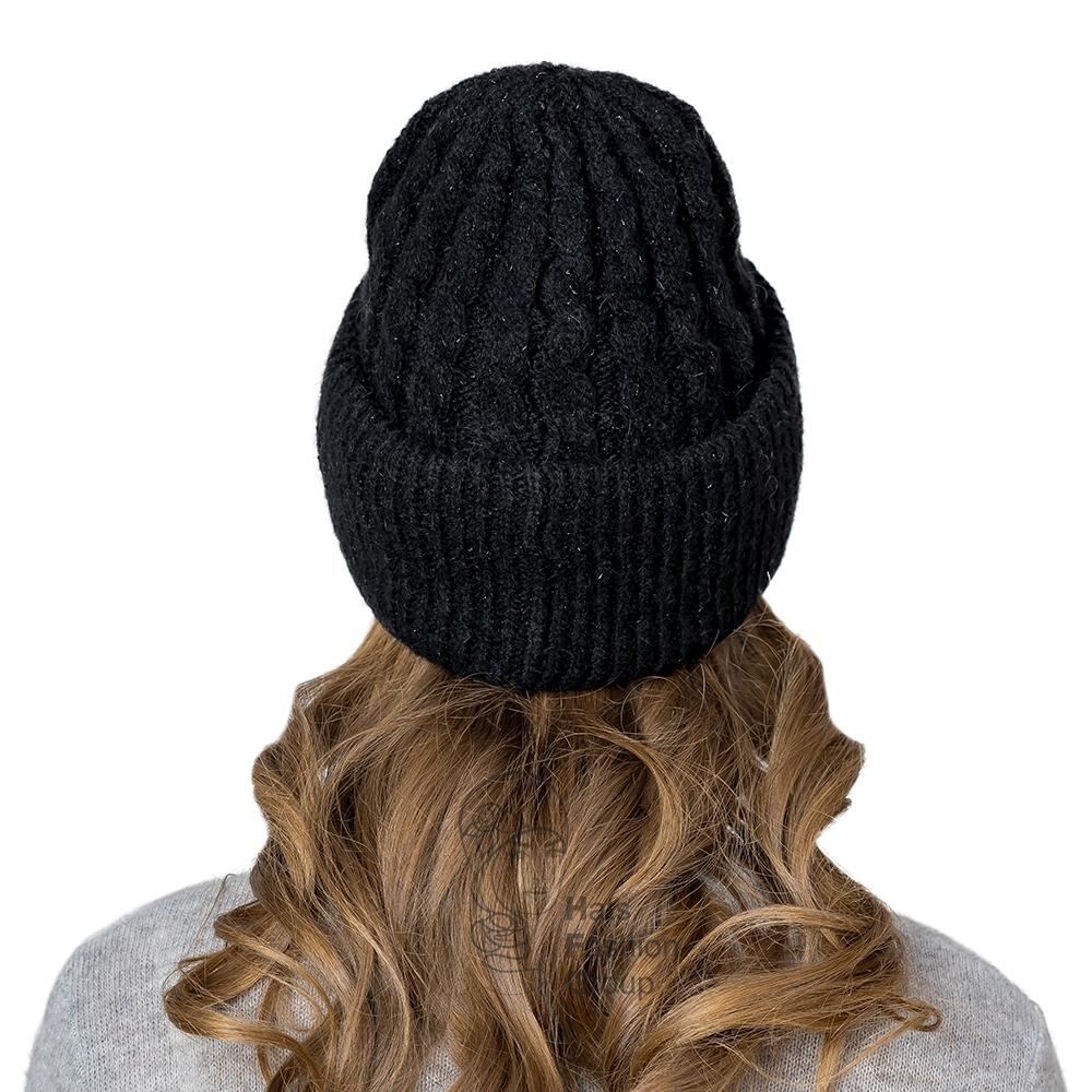 Женская молодежная  шапка бини с двойным отворотом. Украшена фирменной шильдой. В пряжу добавлен люрекс. Он актуален в модных тенденциях текущего сезона.