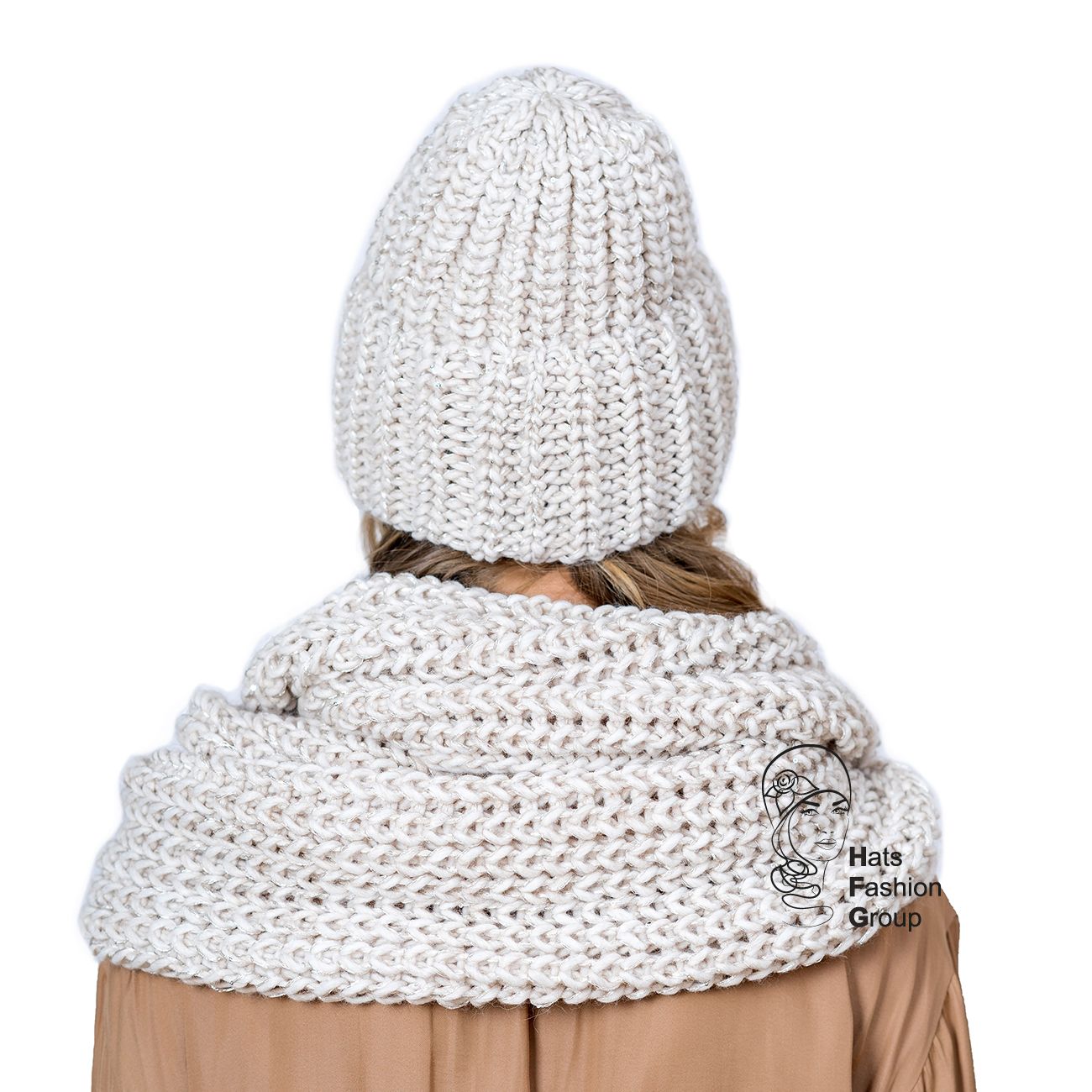 Женский комплект шапка + снуд. Шапка объемная с отворотом и флисовой подкладкой. Подкладка делает изделие комфортным в носке. Шапка выполнена из шерстяной пряжи с добавлением шёлковой пайеточной нити. Сбоку украшена фирменной шильдой. Снуд объемный,  шириной 30 см, длиной 60 см.