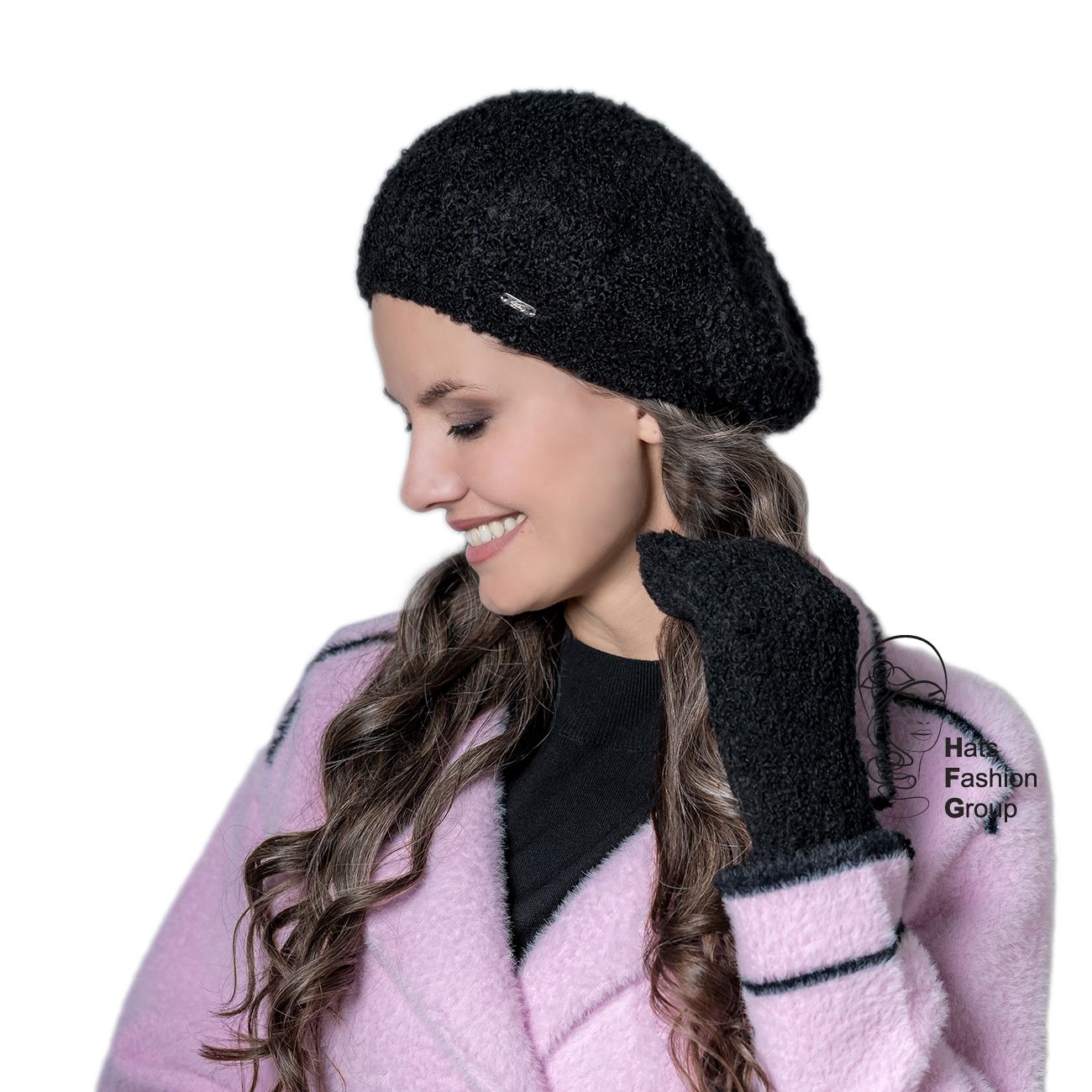 Теплый женский двухслойный берет. Берет изготовлен из  мохеросодержащей буклированной пряжи, которая имитирует овчину, что обеспечивает максимальный комфорт и тепло в холодные дни. Мягкая вязаная модель зимнего берета не колется, тянется и не сдавливает голову. Стильный двойной берет создает неповторимый образ. Наружный диаметр берета 28 см.