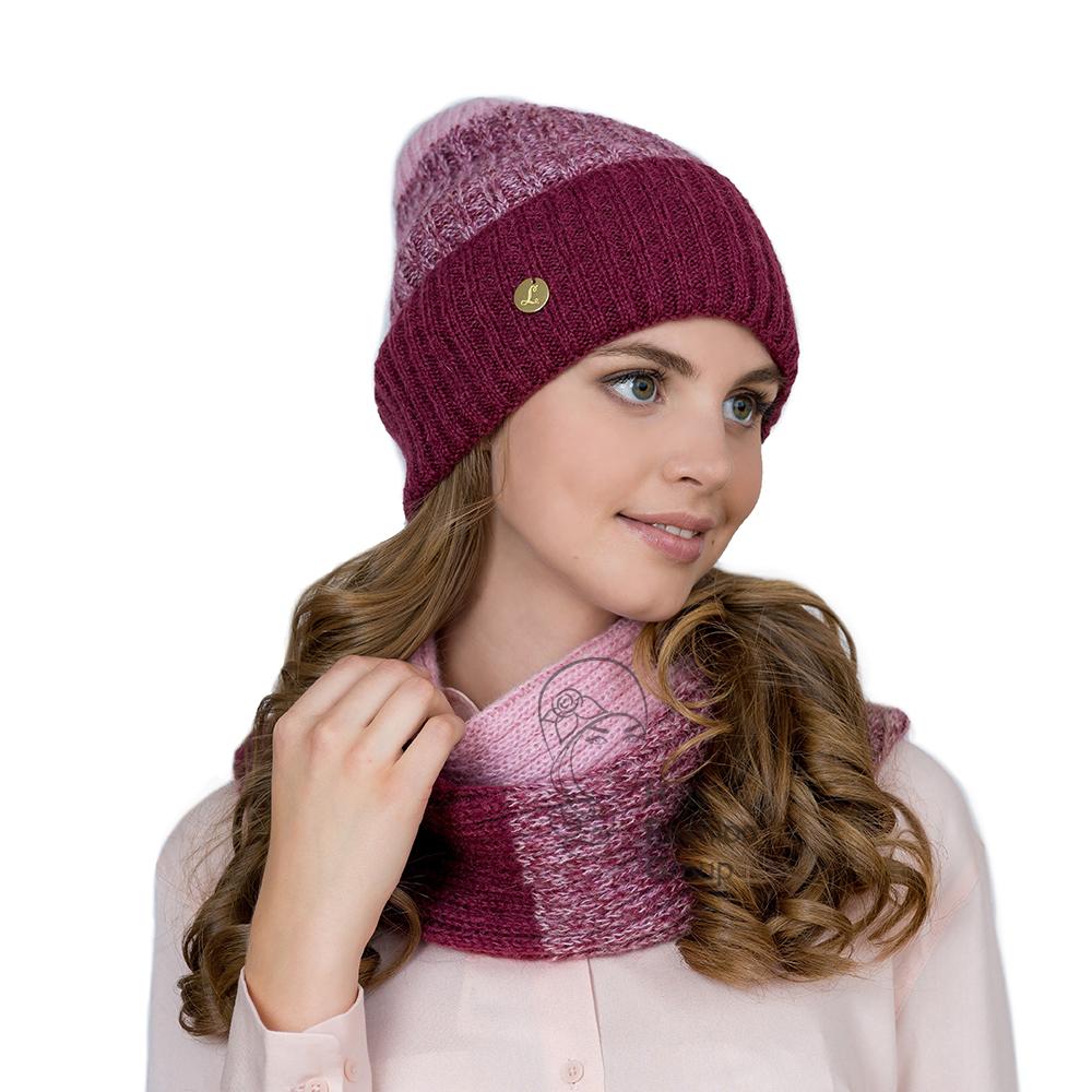 Женский комплект шапка+снуд. Комплект выполнен из мягкого мохера. Шапка с отворотом и флисовой подкладкой. Флисовая подкладка делает изделие комфортным в носке. Модель выполнена в модном стиле «градиент» - плавный переход от одного цвета к другому.Сбоку шапка украшена фирменной шильдой. Снуд размер 20*65 см.