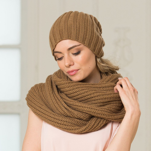 Модный молодежный двойной снуд-восьмерка. Выполнен рельефной вязкой "английская резинка" из итальянской шерстяной пряжи, украшен металлической фирменной шильдой. Сочетается с шапками: Селия, Роберта, Берлин, Токио, Аляска.