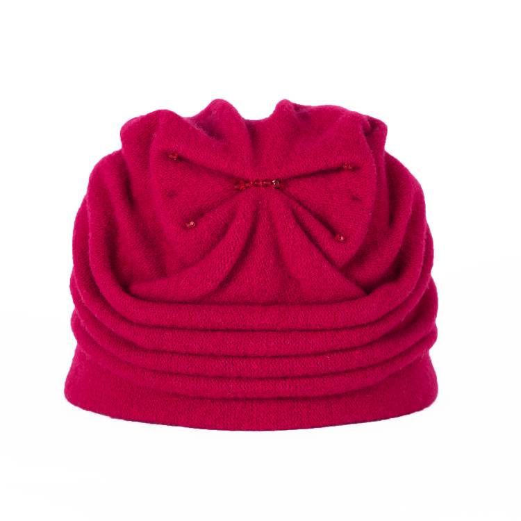 Оригинальная шапка-бандана из шерсти. Сзади на макушке изделие украшают красивая композиция в виде большого стилизованного банта и прозрачные бусины. Складки добавляют дополнительный объем. Сбоку – фирменная шильда.