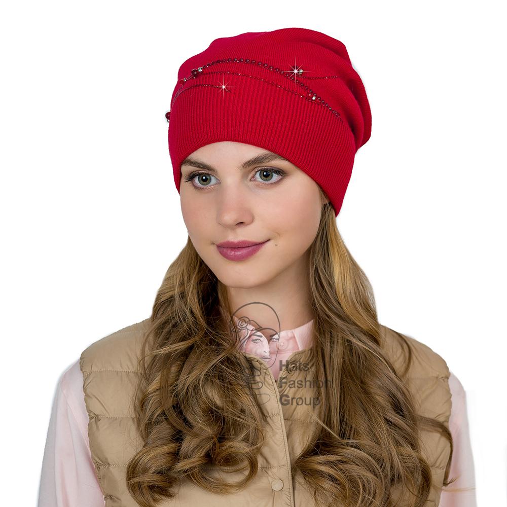 Женская шапка-бандана с внутренним отворотом. Спереди украшена композицией из страз разного диаметра и бусинами. Сзади складки придают дополнительный объем изделию.