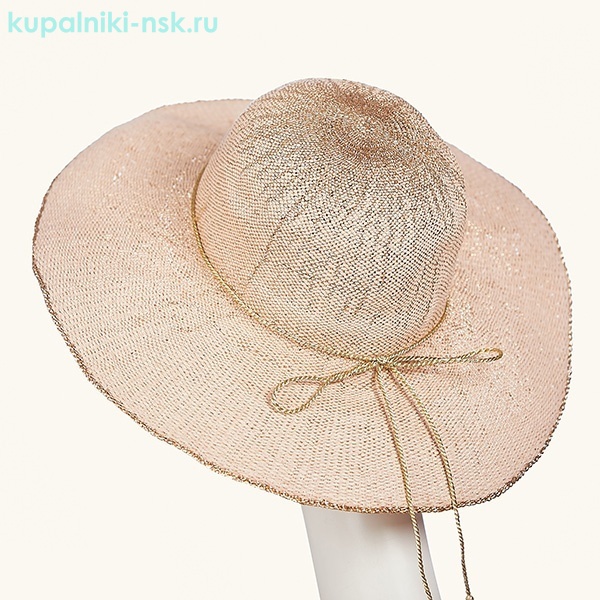 Стильная летняя шляпа с большими полями. Особенность этой шляпы в ее плетении, основой которого является изящный металлизированный жгут. Прекрасный аксессуар для прогулок по городу и пляжного отдыха.