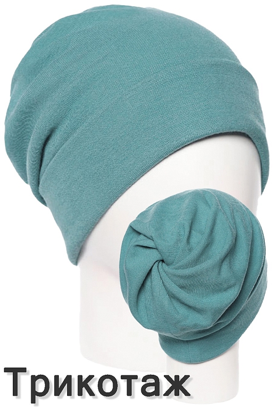 Шапка трикотажная с отворотом на подкладе из хлопкового трикотажа. На макушке оригинальная драпировка - отверстие, поэтому данную модель можно носить в двух вариантах: как бини или под хвост/пучок, смотрите фото.