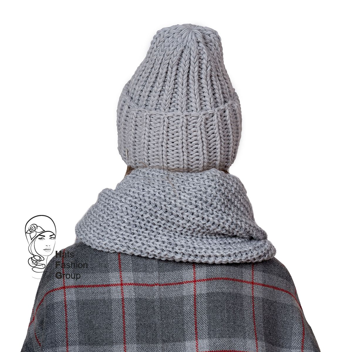 Стильная объемная шапка с отворотом. Шапка выполнена из полушерстяной пряжи. Вязаная модель шапки не колется, тянется и не сдавливает голову.  Сбоку отворот украшен фирменной металлической шильдой. Длина изделия - 26 см. Шапка МАРИКА станет отличным дополнением к вашему гардеробу, подойдет для сочетаний с пальто, куртками, пуховиками, шубами. Универсальная шапка для любого возраста.