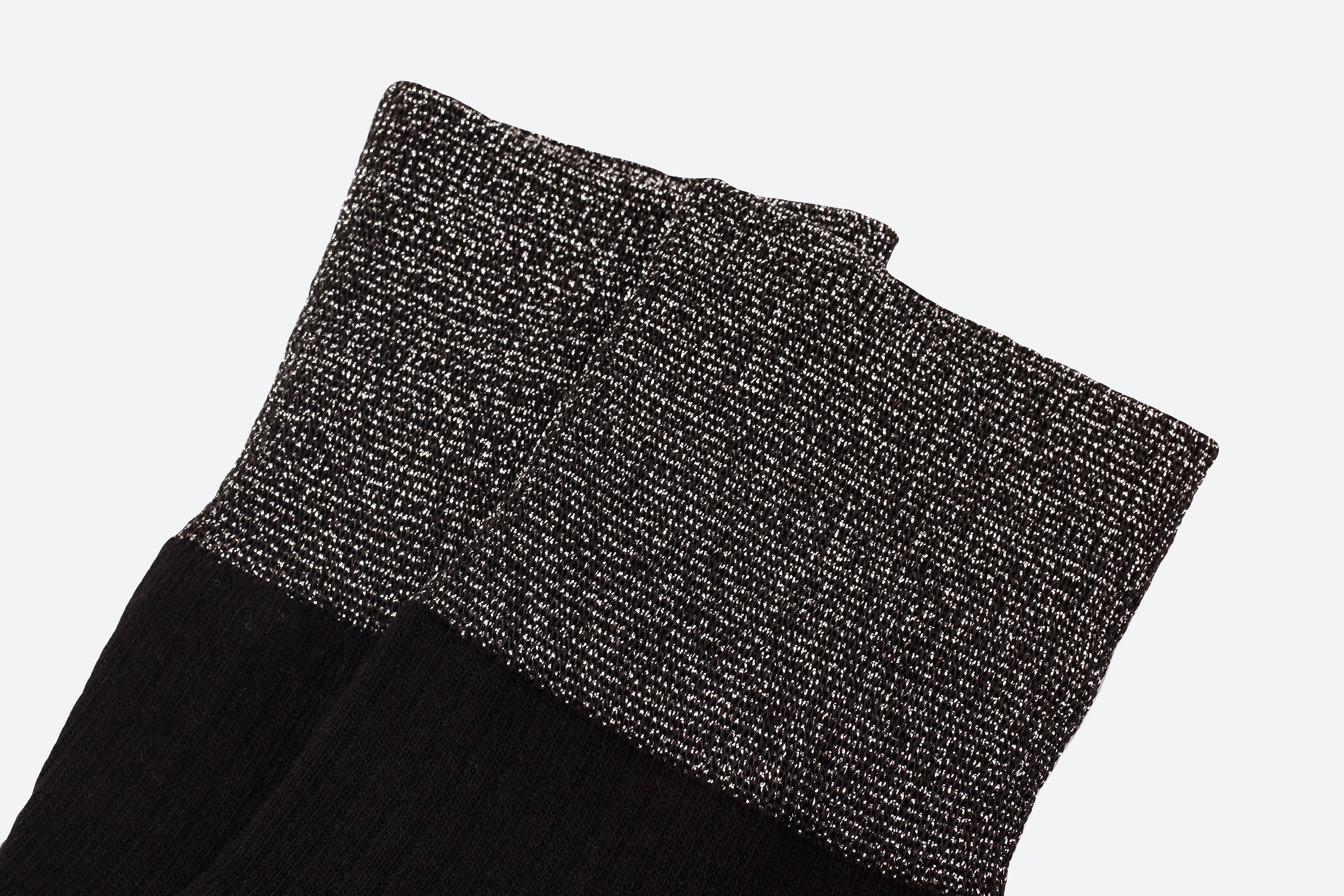 Представляем вам стильные и элегантные женские носки с люрексом. Эти носки выполнены в классическом черном цвете, который идеально сочетаются с любой обувью. Носки имеют люрексовую отделку серебряного цвета на пятке, на носке и по верху, что придает им особый блеск и изысканность.